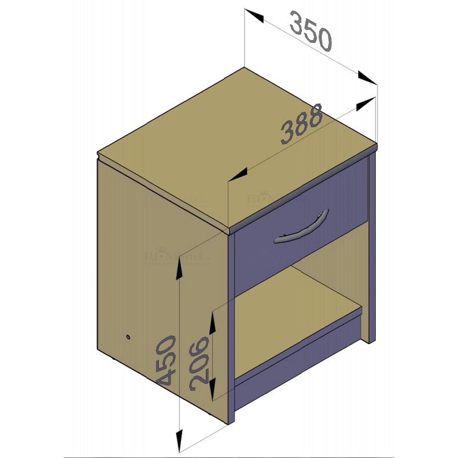 Noční stolek, který se bude hodit do každé ložnice díky své jednoduchosti. Rozměry jsou: šířka 38,8cm/výška 45cm/hloubka 35cm. Výška otevřeného prostoru je 20,6cm. Stolek se skládá z jednoho šuplíku. Stolek nabízíme ve více barvách. Další kombinace naleznete níže na stránce. Dodáváme v demontu.