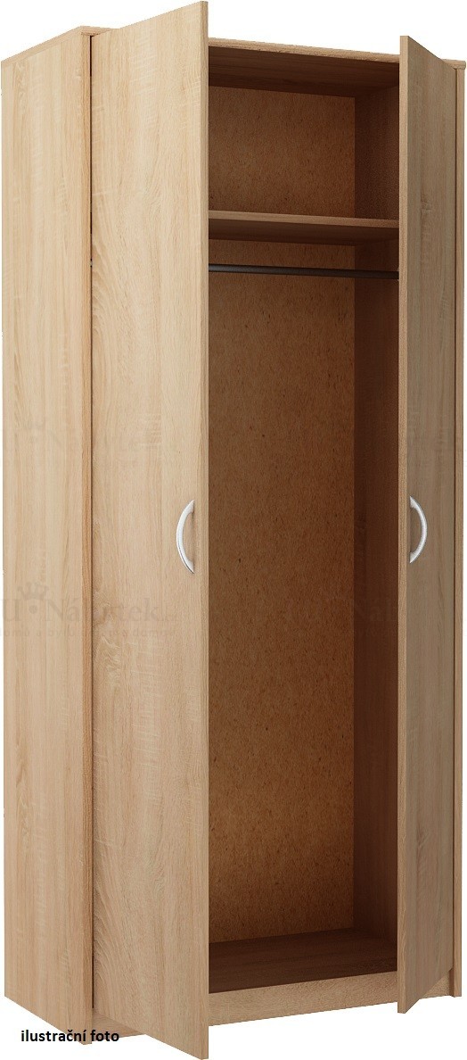 Moderní šatní skříň v jednoduchém designu, která se bude skvěle hodit do každé ložnice. Disponuje vrchní policí a šatní tyčí. Šířka skříně je 85cm, výška 193cm a hloubka je 55cm, díky svým rozměrům se vleze do menších prostorů. V nabídce i v jiném barevném provedení. Dodáváme v demontu.