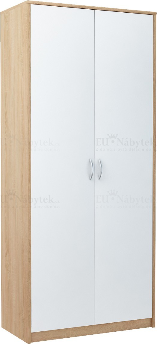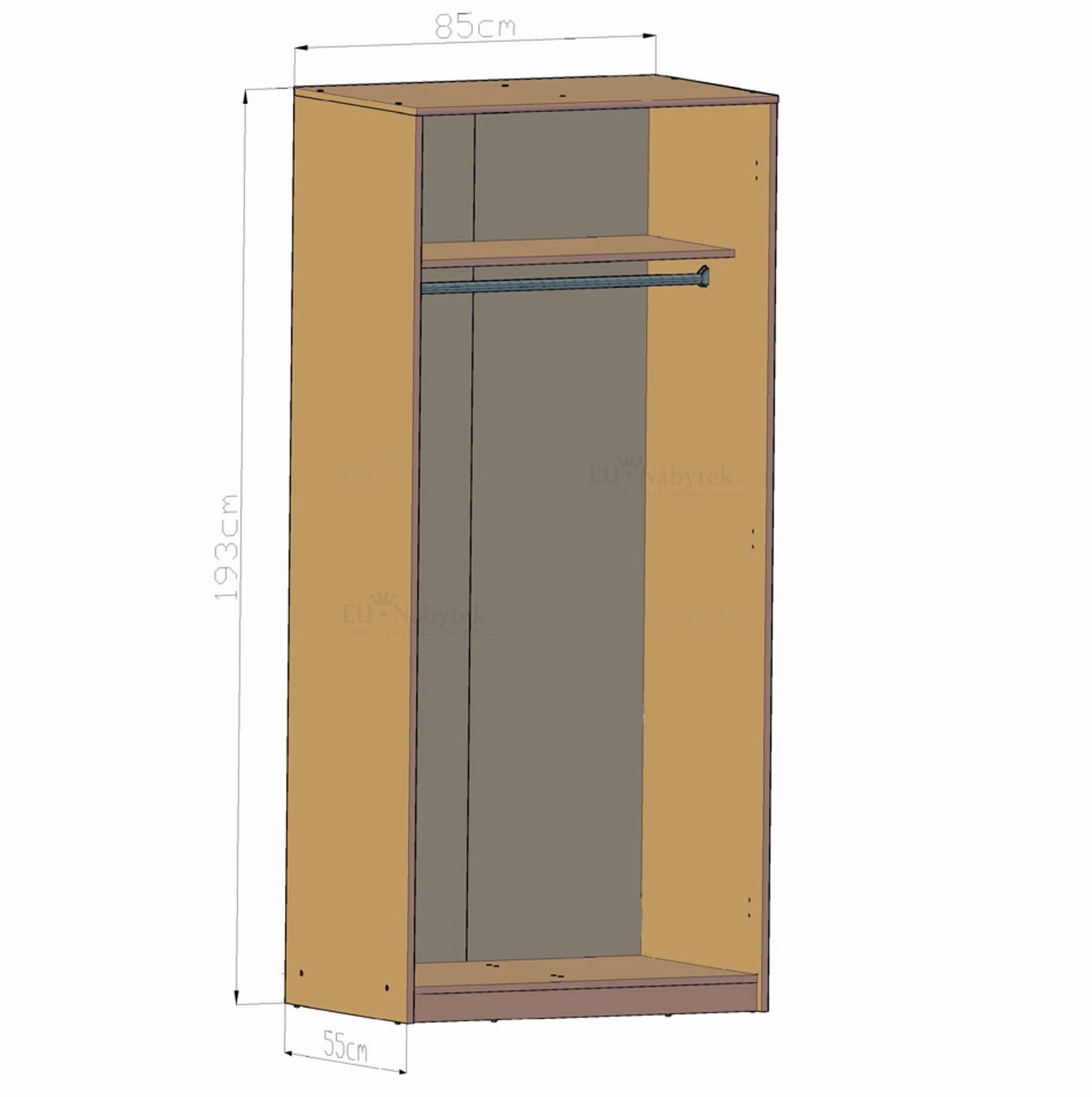 Moderní šatní skříň v jednoduchém designu, která se bude skvěle hodit do každé ložnice. Disponuje vrchní policí a šatní tyčí. Šířka skříně je 85cm, výška 193cm a hloubka je 55cm, díky svým rozměrům se vleze do menších prostorů. V nabídce i v jiném barevném provedení. Dodáváme v demontu.