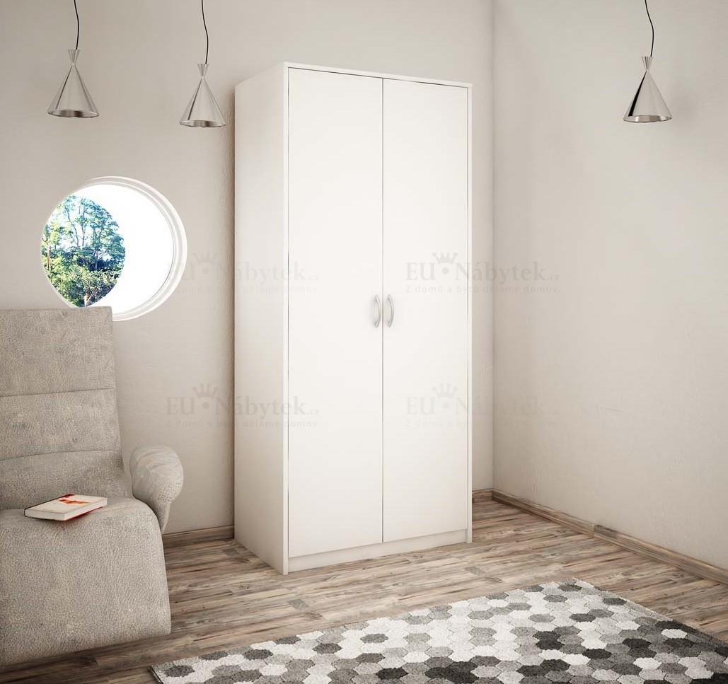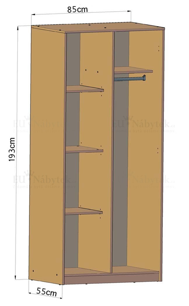 Moderní šatní skříň v jednoduchém designu, která se bude skvěle hodit do každé ložnice. Je tvořena dvěmi sekcemi. V levé části jsou tři police, v pravé jedna plus šatní tyč. Šířka skříně je 85cm, výška 193cm a hloubka je 55cm, díky svým rozměrům se vleze do menších prostorů. V nabídce i v jiném barevném provedení. Dodáváme v demontu.