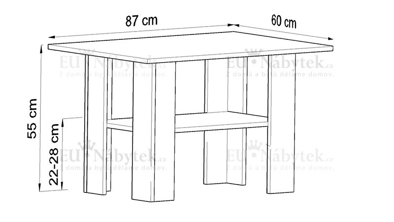 Stylový konferenční stolek, který se bude hodit do každého obývacího pokoje. Tento stolek je vyroben z kvalitního lamina. Výšku spodní poličky si můžete nastavit podle sebe, rozměry stolku jsou: výška 55cm, délka 87cm, šířka 60cm. V nabídce v několika barevných provedeních, které naleznete níže na stránce. Dodáváme v demontovaném stavu.