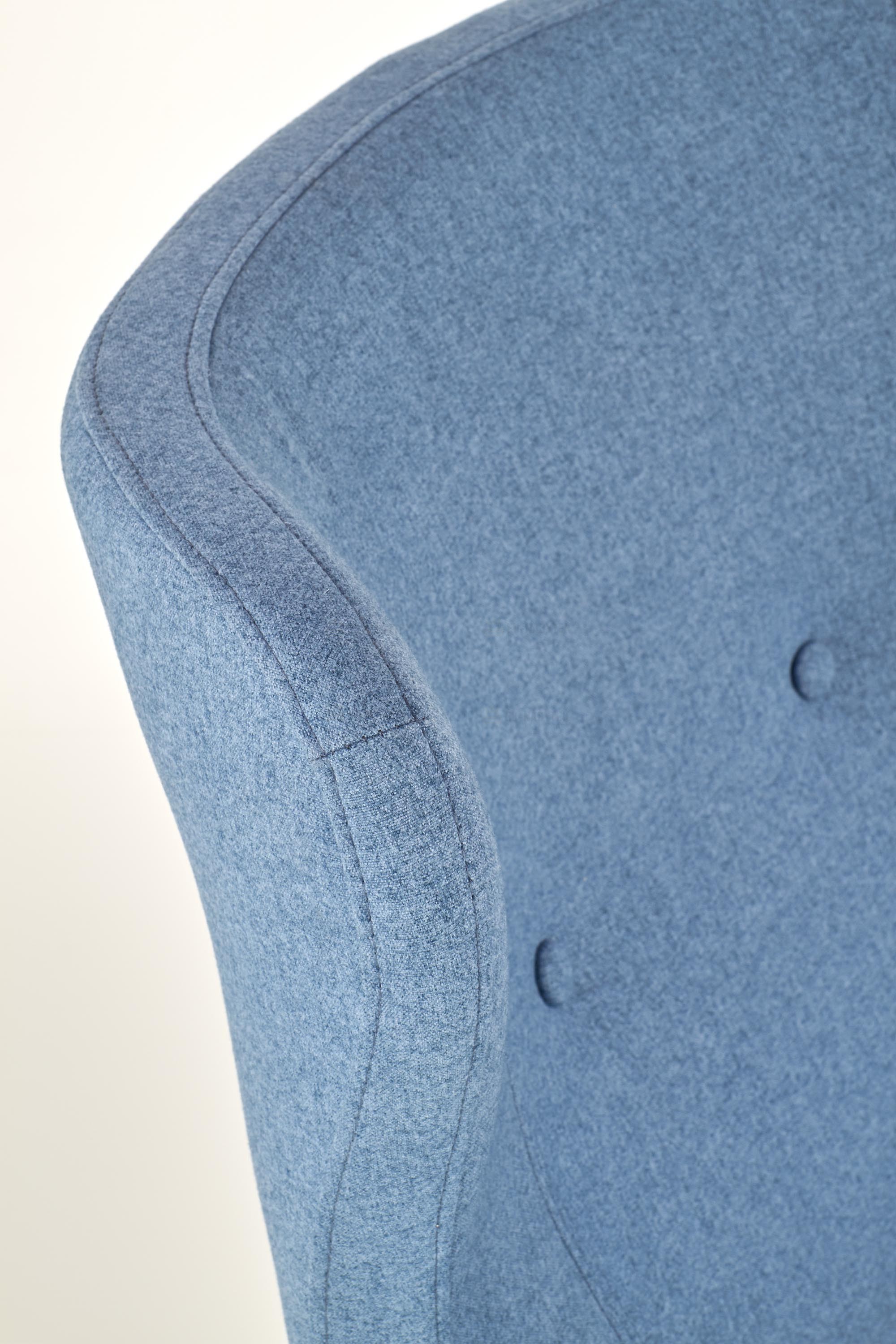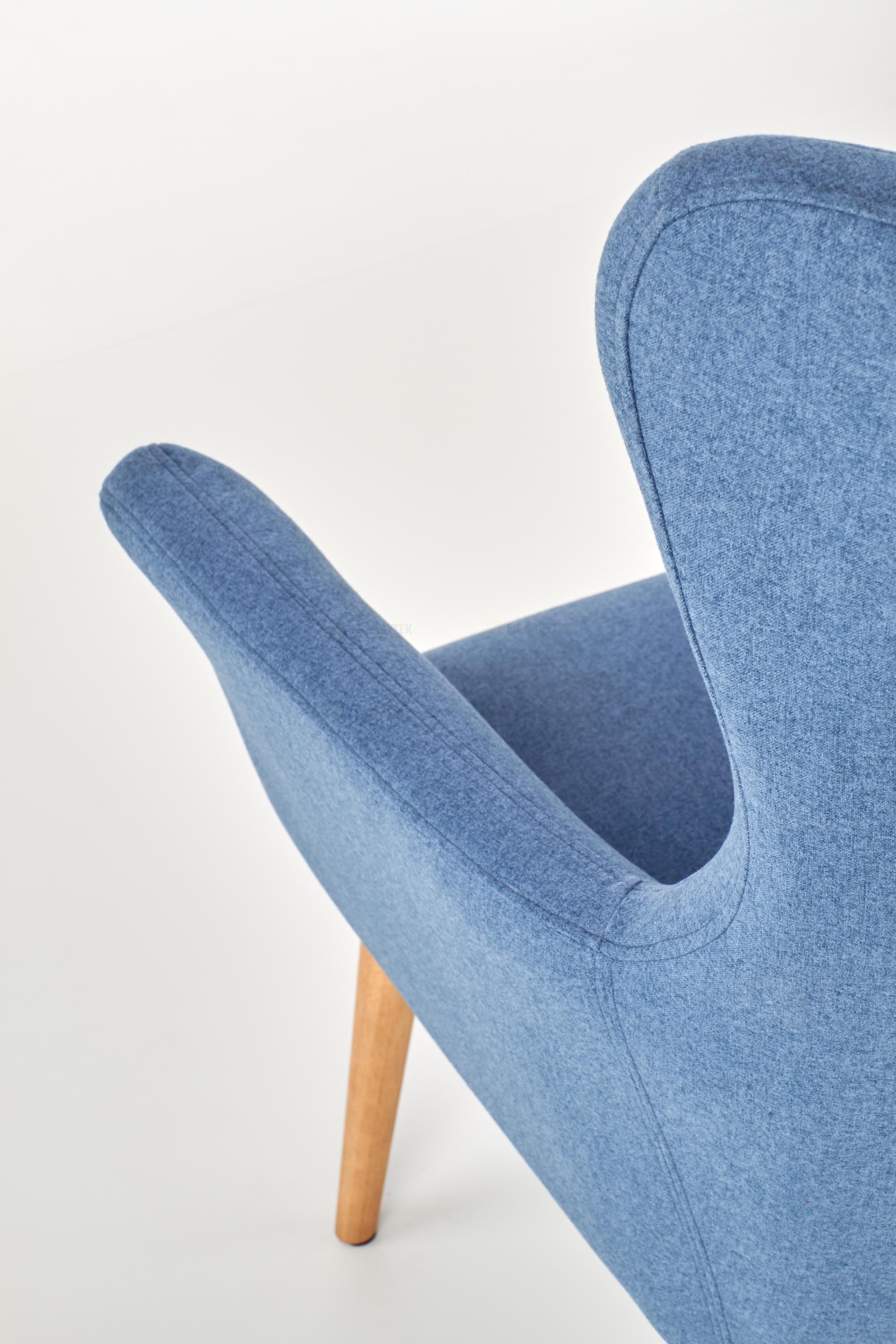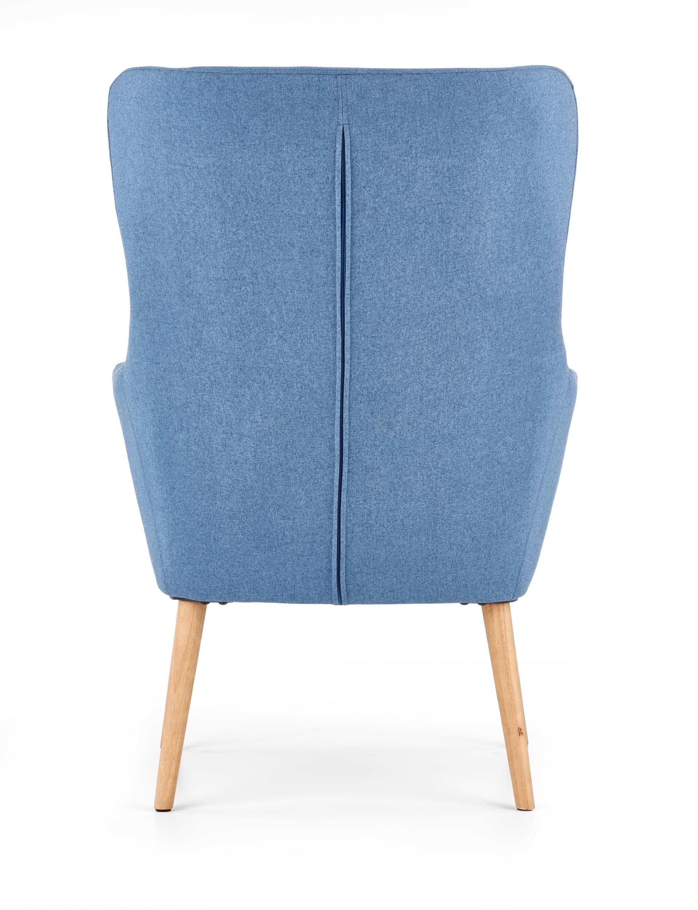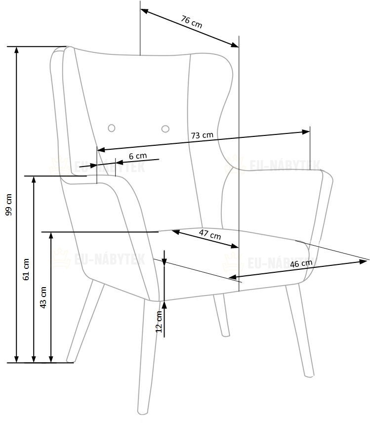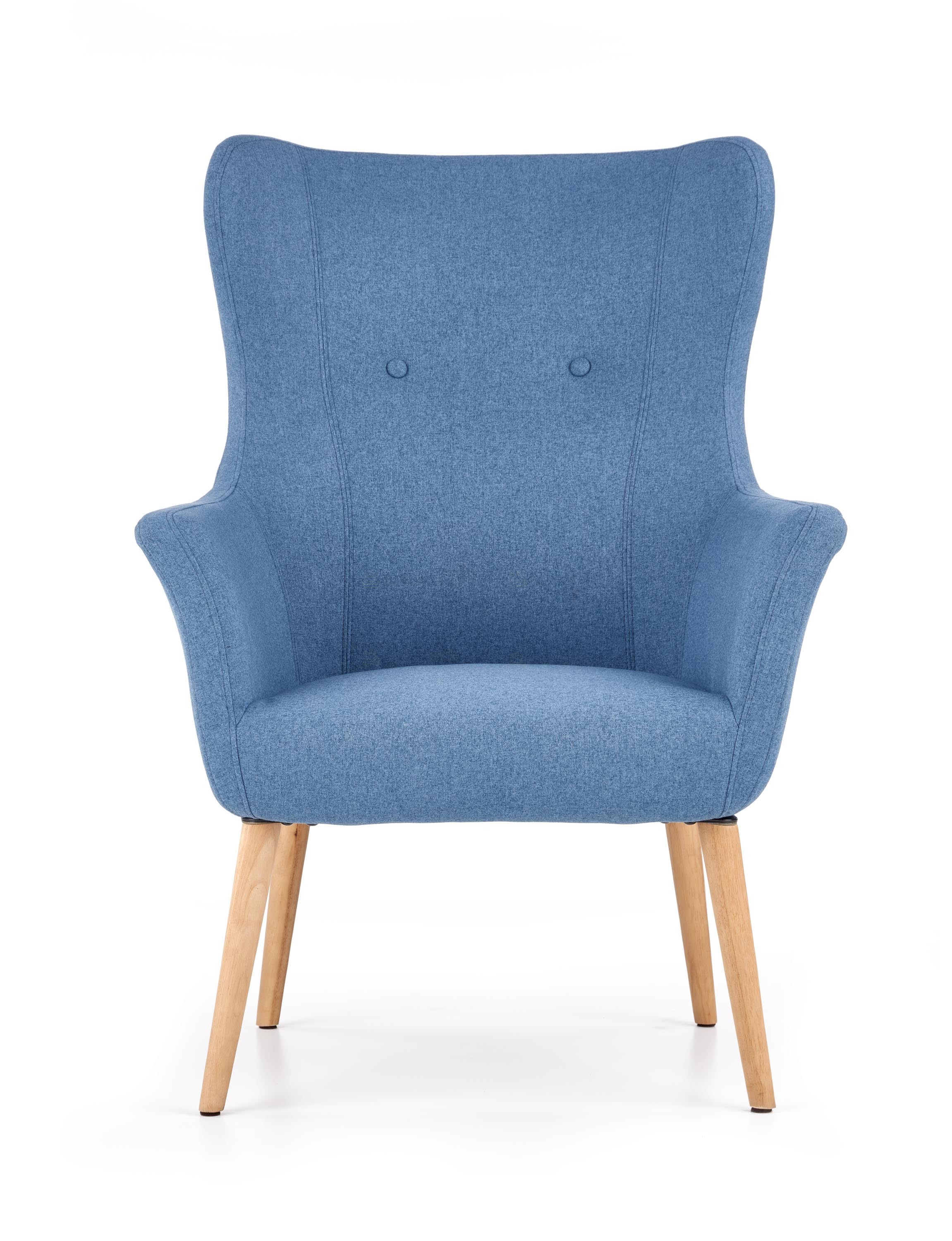 Křeslo o rozměrech 73/76/99/43cm. Čalouněné je modrou látkou. Nohy jsou z masivního přírodního dřeva. Velmi praktické křeslo s vysokou zadní opěrkou. V nabídce i v jiném barevném provedení.