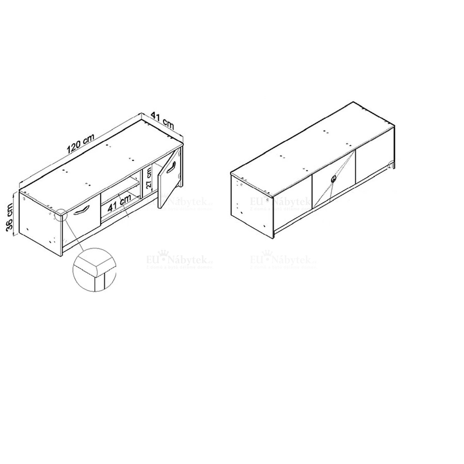 Tento RTV stolek je vyroben z vysoce kvalitní LTD, která se vyznačuje zvýšenou odolností proti poškrábání a odolností proti oděru a vlhkosti. RTV se skládá ze dvou skříní na bocích a jedné police uprostřed. Šířka je 120cm, výška 36cm, hloubka 41cm. V nabídce v několika barevných provedeních, které naleznete níže na stránce. Dodáváme v demontu.