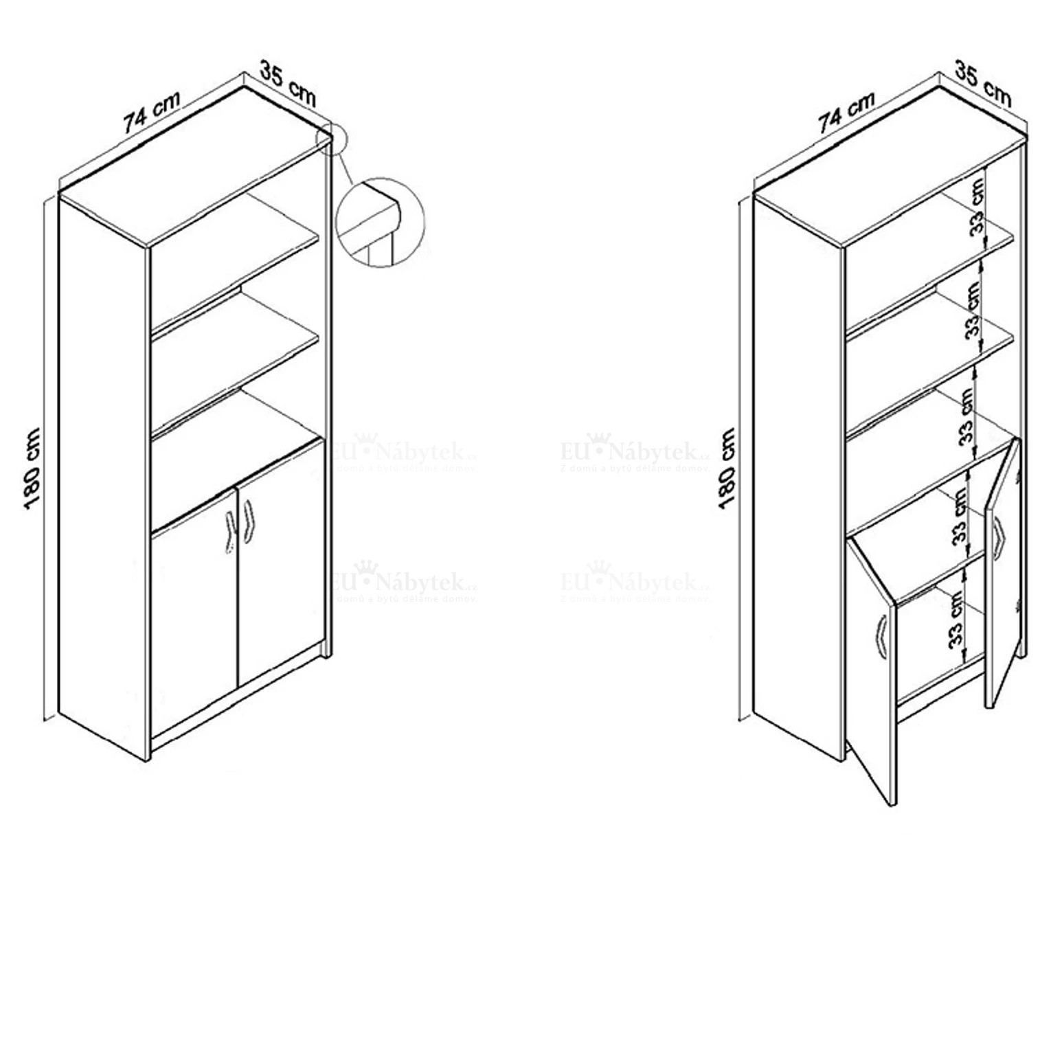 Regál MARKUS se skládá ze 3 polic a 2 dvířek za nimiž se nachází 2 policové úložné prostory. Svou jednoduchostí bude hodit do každého obývacího pokoje, ložnice i kanceláře. Je vyroben z kvalitní LTD. Rozměry jsou: šířka 74cm, výška 180cm, hloubka 35cm. V nabídce v několika barevných provedeních, které naleznete níže na stránce. Dodáváno v demontu.