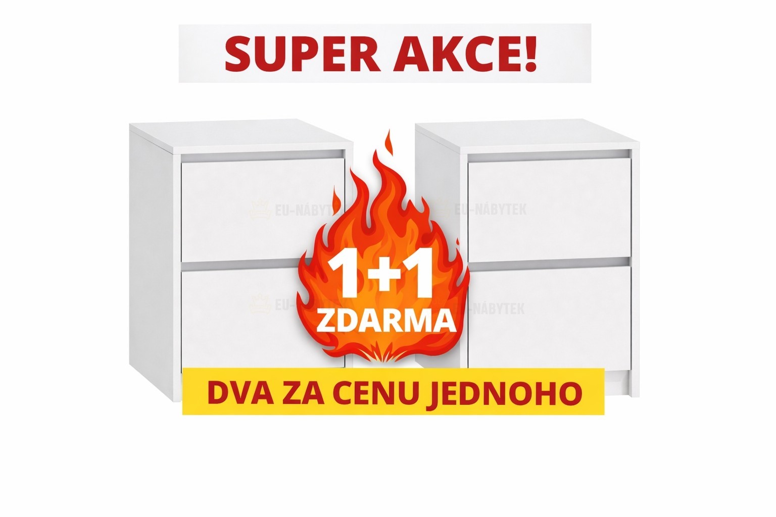 Moderní noční stolek v bílé barvě nyní v akční nabídce 1+1 ZDARMA – dva kusy za cenu jednoho. Ideální řešení k manželské posteli – získáte oba noční stolky najednou za zvýhodněnou cenu.