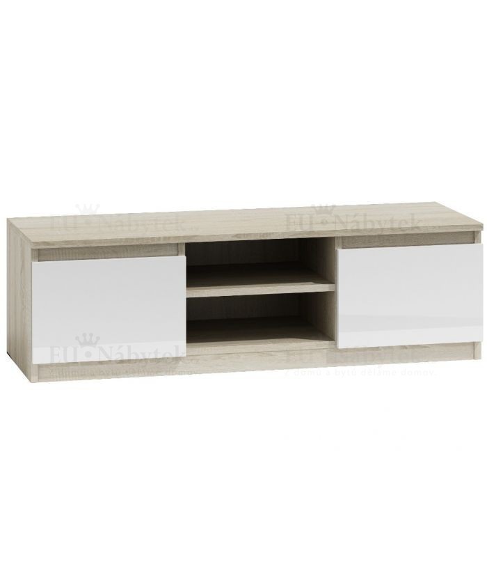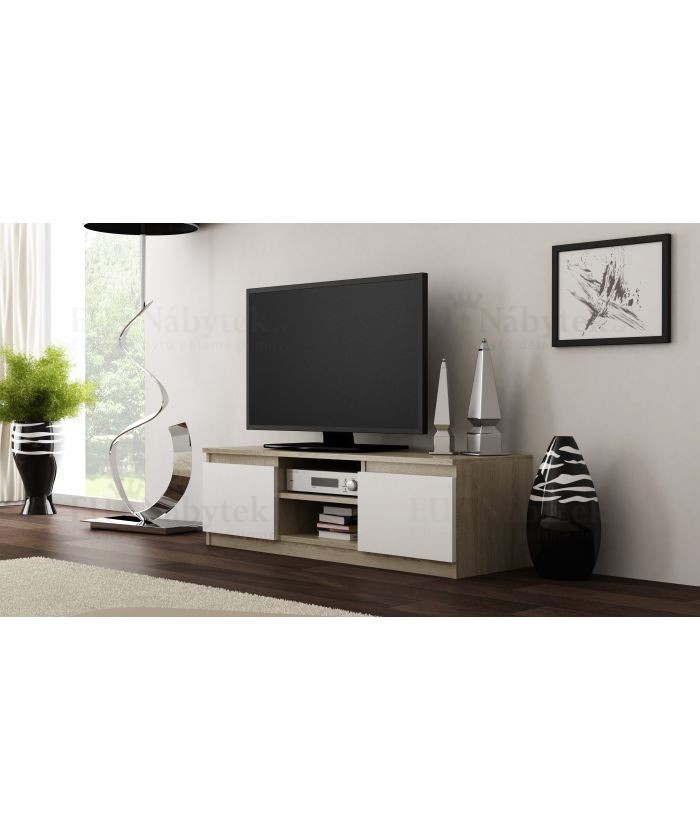 Praktický RTV stolek vyroben z kvalitního lamina odpovídající současnému designu. Hrany jsou ukončeny PVC páskou, která zaručuje dlouhou životnost. RTV stolek disponuje dvěmi skříňkami a praktickou poličkou. V provedení dub sonoma/bílá mat. Rozměry jsou (ŠxVxH) 120x36x40cm.