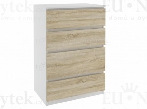 Moderní komoda vyrobena z kvalitního lamina řešená bezúchytkovým systémem. Disponuje čtyřmi zásuvkami. Hrany jsou zakončeny ABS páskou, která zaručuje dlouhou životnost. Rozměry (ŠxVxH) 66x102x40cm. V barevném provedení bílá/dub sonoma.