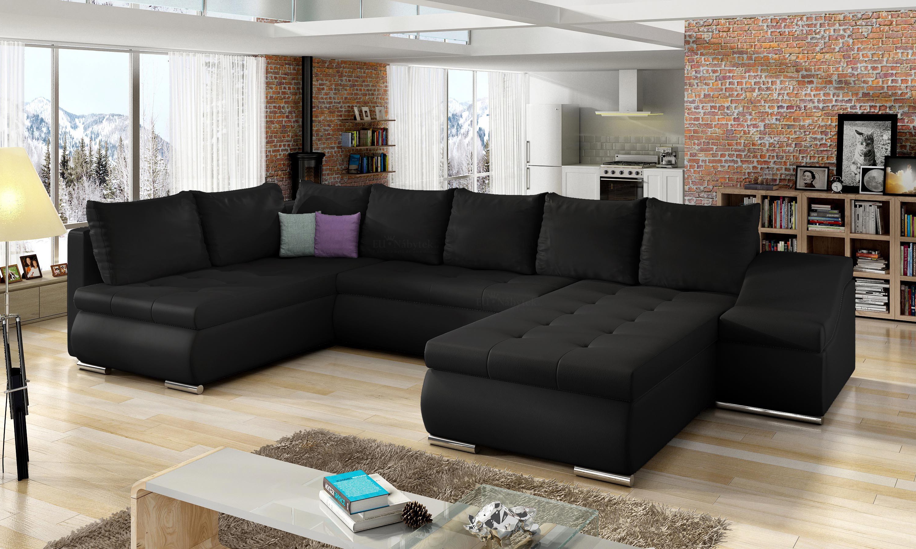 Netradiční prostorná sedačka TORONTO U s úložným prostorem a rozkladem pro příležitostné spaní. Po rozložení vzniká plocha na spaní 295 x 120 cm. Sedací plocha je vyplněna PUR pěnou a pružinami Faliste, kostra sedačky je v kombinaci masivního dřeva a dřevotřísky Barevné provedení - černá ekokůže soft 11. Dodávano v demontu, 4 ks. Na hlavním obrázku je pravý roh.