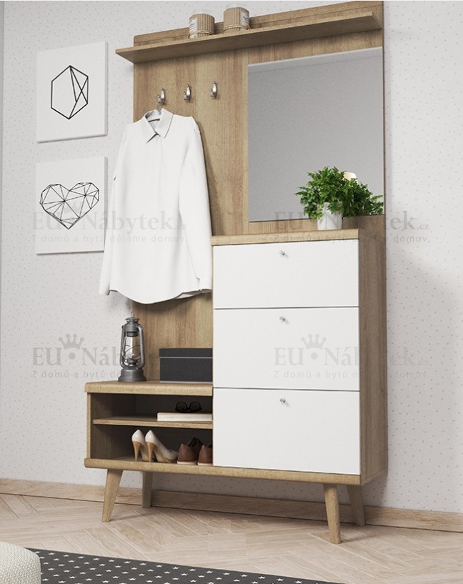 Luxusní předsíňová stěna v barvě dub riviera v kombinaci s bílou, která se hodí do moderně zařízeného interiéru. Nadchne i ty nejnáročnější zákazníky. Vhodná i do menších chodeb. Vyrobena je z kvalitní MDF 16mm, lemovaná ABS. Rozměry jsou 110/200/34cm. Velmi praktická je odkládací polička a zrcadlo, také dostatek úložného prostoru. V nabídce také obývací stěna ze stejné kolekce.