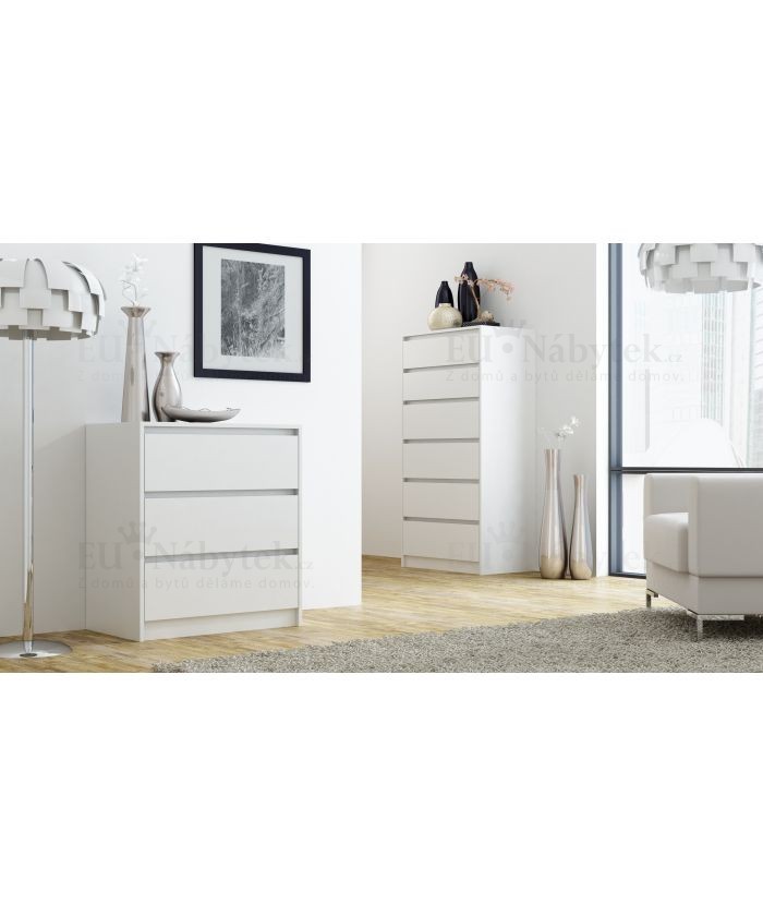 Moderní komoda vyrobena z kvalitního lamina řešená bezúchytkovým systémem. Hrany jsou zakončeny PVC páskou, která zaručuje dlouhou životnost. Rozměry (ŠxVxH) 70x78x43cm. V barevném provedení bílá. Níže na stránce naleznete další barvy.