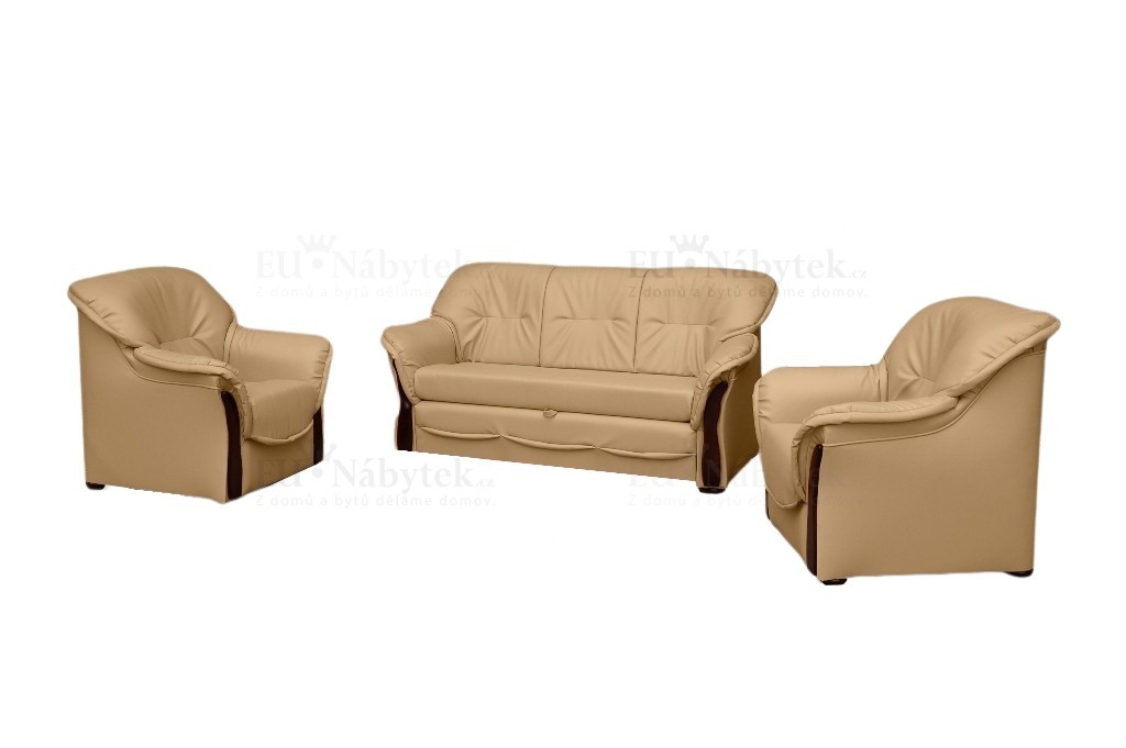 Pohodlná a prostorově nenáročná sedací souprava, která je celočalouněná, tudíž vhodná do prostoru. Po dlouhodobých zkušenostech z výroby a prodeje prošla mnoha inovacemi. Pohodlné sezení zaručují pružiny faliste a PUR pěna T30. Nový systém prošití vylučuje povolení a následné zvlnění potahové tkaniny. Sedací souprava má kvalitní systém rozkládání. Souprava se skládá ze dvou křesel a pohovky, která po rozložení disponuje spací plochou 190 x 140 cm. Čalouněná je látkou Sahara 11.
