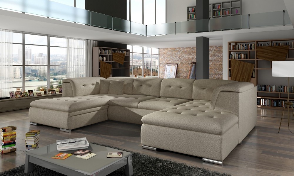 Rozkládací rohová sedačka SANTIAGO s velkoryse řešeným prostorem k sezení. Sedačka je opravdu rozměrná, s délkou téměř 4 m, je vhodná do prostornějších pokojů. Díky dvoum velkým otomanům je vhodným řešením pro velkou rodinu ale i pro ty co mají rádi opravdové pohodlí. Má také úložný prostor a disponuje rozkládacím systémem, díky kterému se plocha na spaní zvětší na 145 x 282 cm. Sedací souprava je čalouněná látkou Inari 96 a eko kůží Madryt 120.