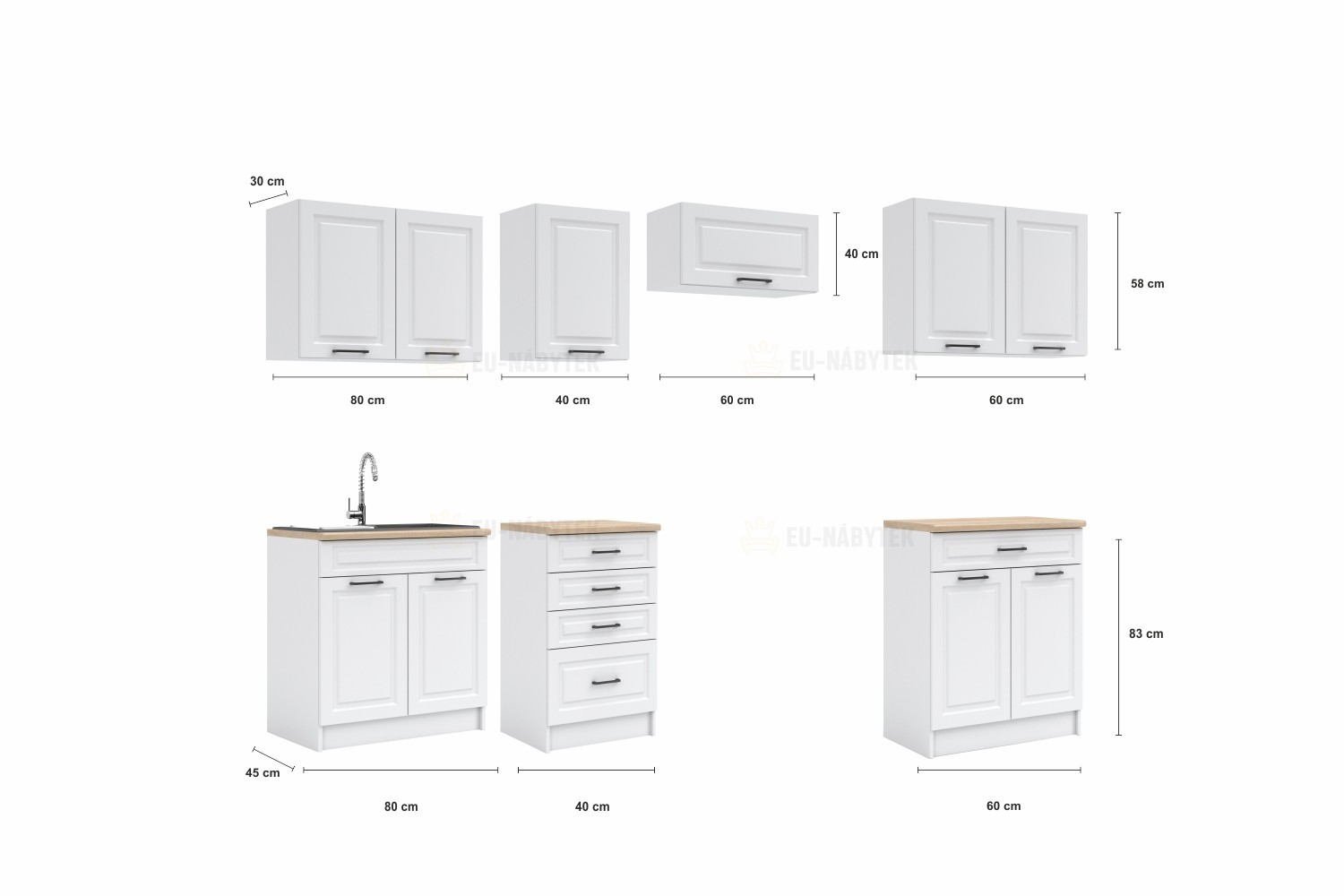 Moderní kuchyňská linka ASTA v oblíbeném skandinávském stylu. Kuchyně je vhodná i do panelákových bytů. Je navržena tak, že skříňky se dají poskládat v libovolném pořadí. To vám umožní si sestavit kuchyni podle svých představ. Možnost dokoupení dalších skříněk, které naleznete níže na stránce. Korpus i dvířka jsou v provedení bílá mat. Pracovní deska je v ceně v barvě dub hamilton, která je dodávána vcelku 100cm (kromě skříňky na dřez). Úchytky jsou kovové v provedení černá mat. Hloubka spodních skříněk bez PD (korpus) = 45 cm, s PD = 60 cm. Sestava se skládá ze spodních skříněk (šxvxh) - dřezová 80x83x45cm, 40x83x45cm, 60x83x45cm a horních skříněk - 80x58x30cm, 40x58x30cm, digestořová 60x40x30cm a 60x58x30cm. Dodáváme v demontovaném stavu a bez spotřebičů, dřezu a dekorací.