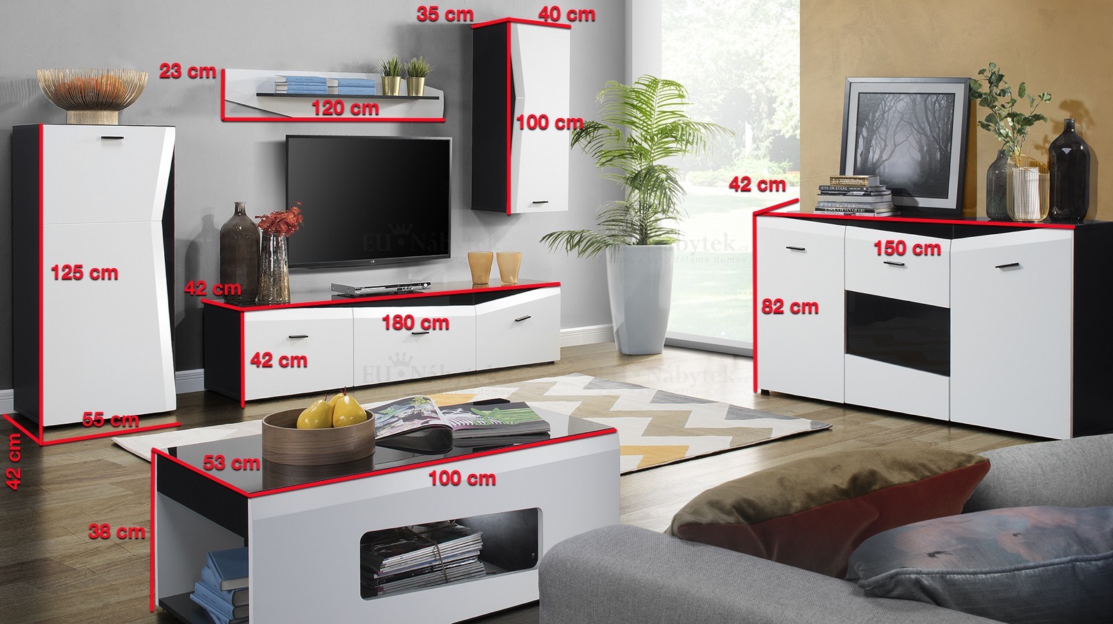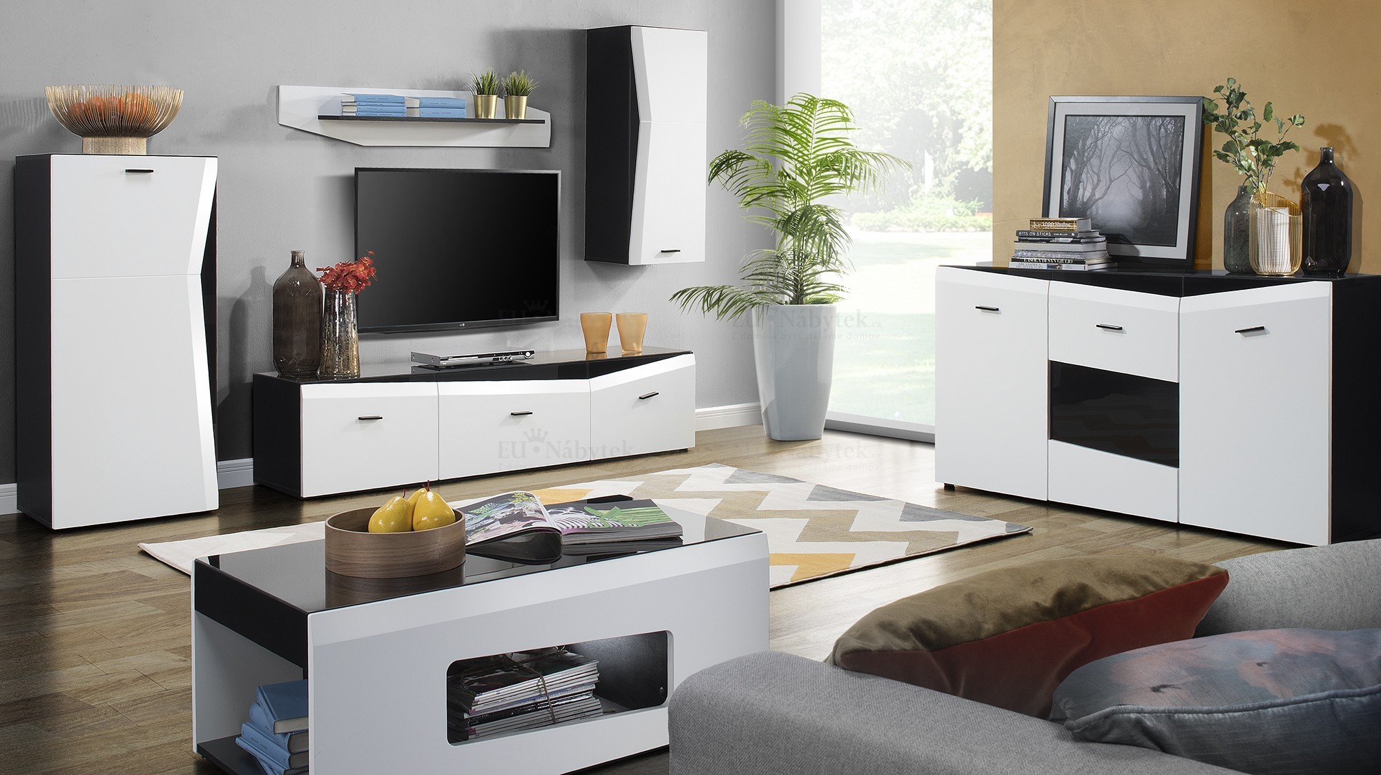 Obývací stěna Vekra zdůrazňuje unikátní design nábytku. Stylová kompozice moderního nábytku zaručuje nejen reprezentativní zařízení daného interiéru, ale také i vysokou funkčnost, kterou ocení dokonce i nejnáročnější zákazníci. Spojení černého matného korpusu a bílého a černého lesku viditelného na dvířkách obohatí užitnou plochu a zároveň ozvláštní její celý prostor. Dodáváme v demontu. V ceně obývací stěny je RTV, skříňka, závěsná skříňka a police.