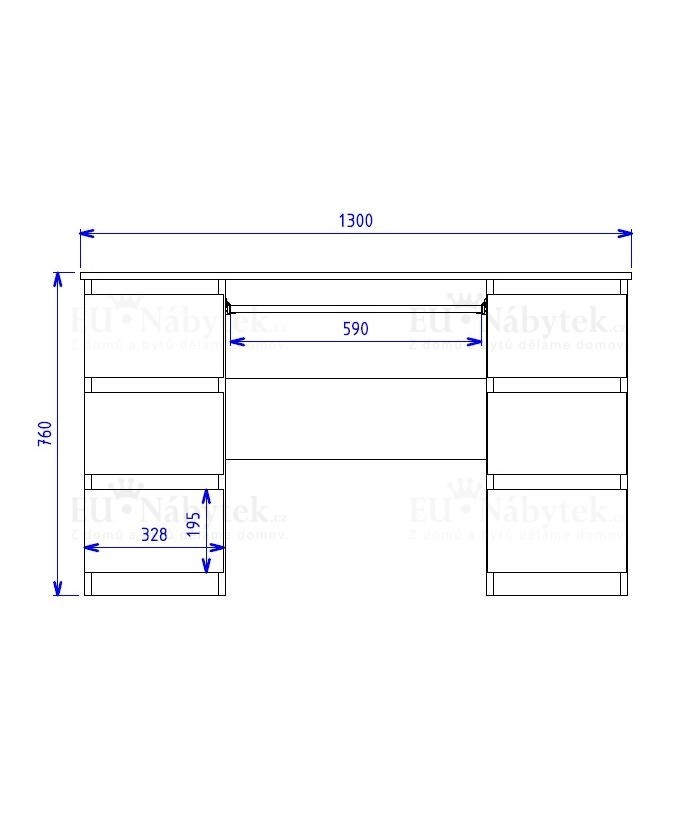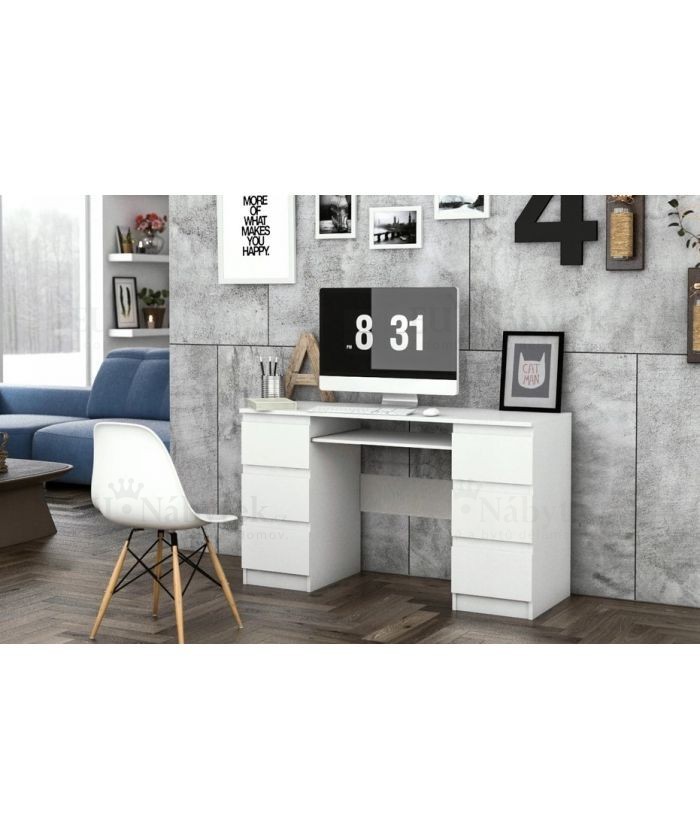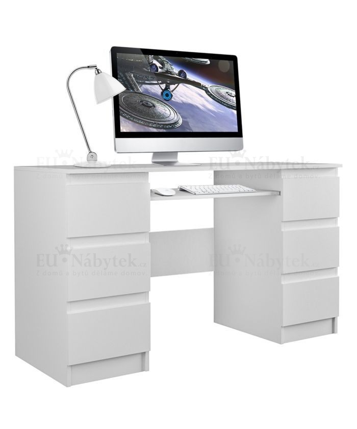 Prostorný PC stůl s bezúchytkovým systémem. Vyroben je z kvalitního lamina, hrany lemovány PVC páskou pro vysokou odolnost proti poškození. Disponuje šesti šuplíky. Rozměry jsou 130x76x51cm. Níže na stránce naleznete další barevné varianty.