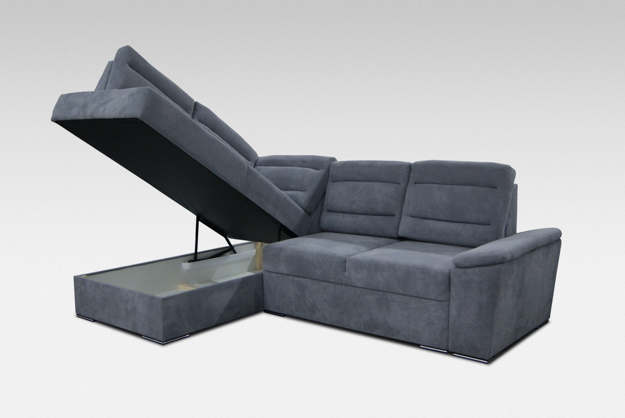 Rozkládací rohová sedačka s úložným prostorem a decentními chromovanými nožičkami. Po rozložení vznikne plocha na spaní 130x200cm. Dva druhy pružin (bonell a faliste) společně s PUR pěnou zaručují pohodlné sezení, sedačka má navíc velmi praktické opěrky s nastavitelnou výškou, kromě opěrek v rohu. Sedačka je čalouněná látkou Alfa 03.