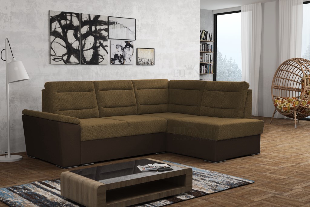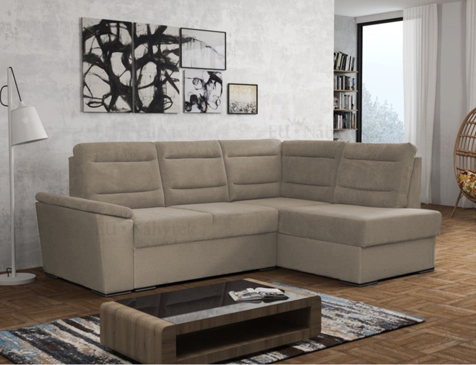 Rozkládací rohová sedačka s úložným prostorem a decentními chromovanými nožičkami. Po rozložení vznikne plocha na spaní 130x200cm. Dva druhy pružin (bonell a faliste) společně s PUR pěnou zaručují pohodlné sezení, sedačka má navíc velmi praktické opěrky s nastavitelnou výškou, kromě opěrek v rohu. Sedačka je čalouněná látkou Malmo 23 a Malmo 28.