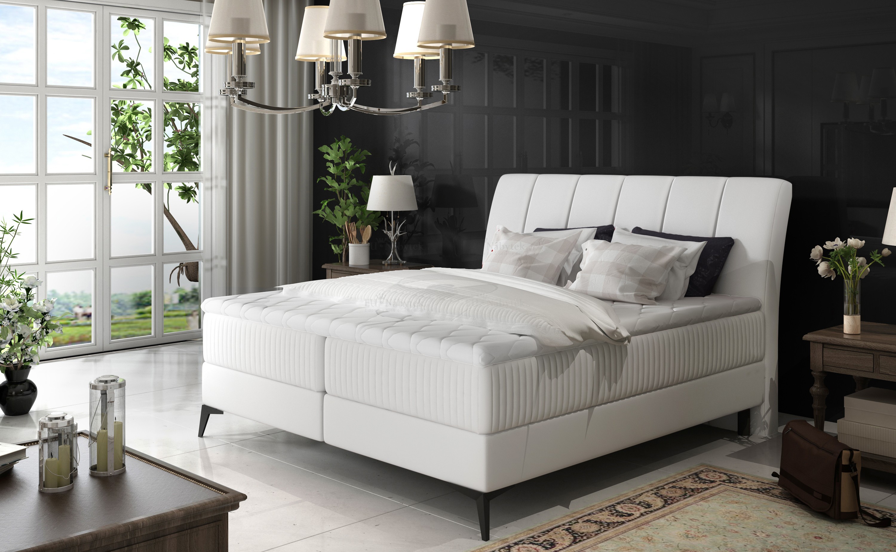 Kontinentální postel BOXSPRING vyniká svým jedinečným vzhledem. Boxspring je postelový systém, který můžete znát ze zahraničí či luxusních hotelů. Tato postel je nejen specifická svým vysokým násedem, ale hlavně díky svému složení odlišná od klasických postelí. Základním prvkem této postele Boxspring je spodní 20 cm devíti zónová pružinová (bonell) matrace v rámu, která slouží jako prevence ortopedických vad páteře a ventilační podklad horní vyrovnávací tenké matrace - topperu. Toto spojení garantuje spokojenost jak z hlediska hygienického, tak i ortopedického a relaxačního. Postel obsahuje úložný prostor (viz fotogalerie). Dodávano v demontu. Čalouněná je ekokůží Soft 17.