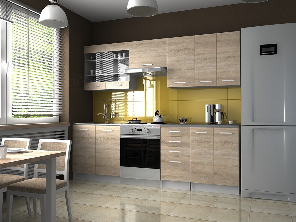 Moderní kuchyně vhodná i do panelákových bytů. Tato kuchyně je navržena tak, že skříňky se dají poskládat v libovolném pořadí. To vám umožní si sestavit kuchyni podle svých představ. Pracovní deska je dodávána v barvě šedá, která je dodávána vcelku 100cm (kromě skříňky na dřez). Korpus je v bílé barvě 18mm. Hrany jsou lemovány ABS páskou 0,6mm. Dvířka jsou vyrobena z kvalitní MDF 16 mm v barevném provedení dub sonoma. Sestava se skládá ze spodních skříněk - výška 82 (bez PD), hloubka 45, šířka 80/40/60 cm a vrchních skříněk - výška 72, hloubka 30, šířka 80/60/40/60 cm. Úchyty jsou plastové v šedé barvě. Spotřebiče, dřez a digestoř nejsou v ceně. Kuchyň nabízíme také v dalších barevných variantách, které naleznete níže na stránce. Možnost doobjednání dřezu. Dodáváme v demontovaném stavu.
