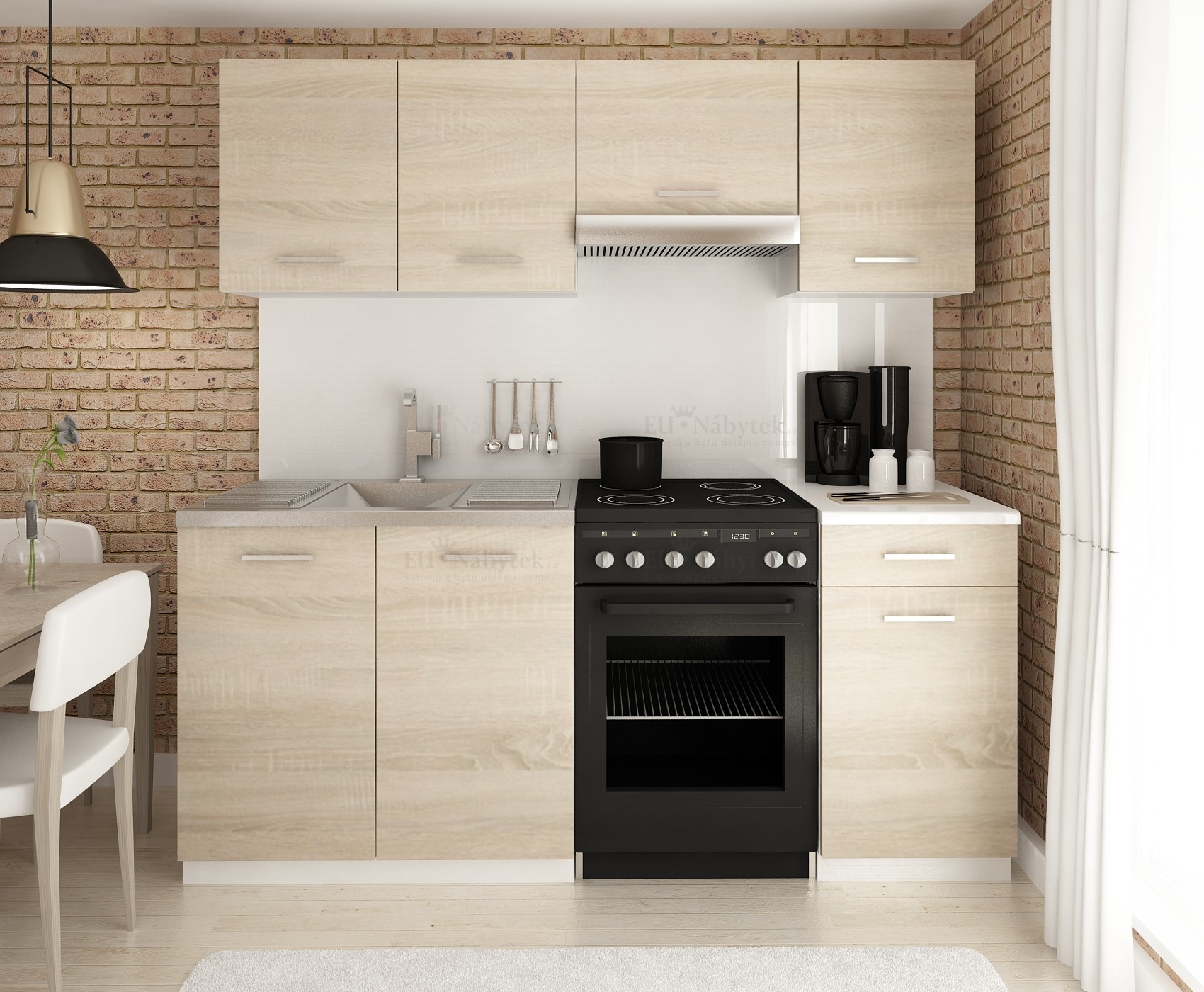 Moderní kuchyně vhodná i do panelákových bytů. Tato kuchyně je navržena tak, že skříňky se dají poskládat v libovolném pořadí. To vám umožní si sestavit kuchyni podle svých představ. Pracovní deska je dodávána v barvě bílá, která je dodávána vcelku 40cm (kromě skříňky na dřez). Korpus je v bílé barvě 18mm. Hrany jsou lemovány ABS páskou 0,6mm. Dvířka jsou vyrobena z kvalitní MDF 16 mm v barevném provedení dub sonoma. Sestava se skládá ze spodních skříněk - výška 82 (bez PD), hloubka 45, šířka 80/40 cm a vrchních skříněk - výška 58, hloubka 30, šířka 80/60/40 cm. Úchyty jsou plastové v šedé barvě. Spotřebiče, dřez a digestoř nejsou v ceně. Kuchyň nabízíme také v dalších barevných variantách, které naleznete níže na stránce. Možnost doobjednání dřezu. Dodáváme v demontovaném stavu.