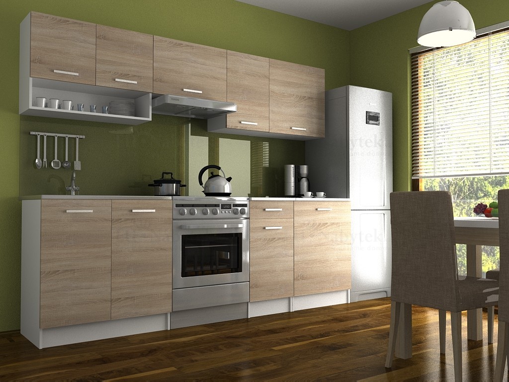 Moderní kuchyně vhodná i do panelákových bytů. Tato kuchyně je navržena tak, že skříňky se dají poskládat v libovolném pořadí. To vám umožní si sestavit kuchyni podle svých představ. Pracovní deska je dodávána v barvě bílá, která je dodávána vcelku 100cm (kromě skříňky na dřez). Korpus je v bílé barvě 18mm. Hrany jsou lemovány ABS páskou 0,6mm. Dvířka jsou vyrobena z kvalitní MDF 16 mm v barevném provedení dub sonoma. Sestava se skládá ze spodních skříněk - výška 82 (bez PD), hloubka 45, šířka 80/40/60 cm a vrchních skříněk - výška 58, hloubka 30, šířka 80/60/40/60 cm. Úchyty jsou plastové v šedé barvě. Spotřebiče, dřez a digestoř nejsou v ceně. Kuchyň nabízíme také v dalších barevných variantách, které naleznete níže na stránce. Možnost doobjednání dřezu. Dodáváme v demontovaném stavu.