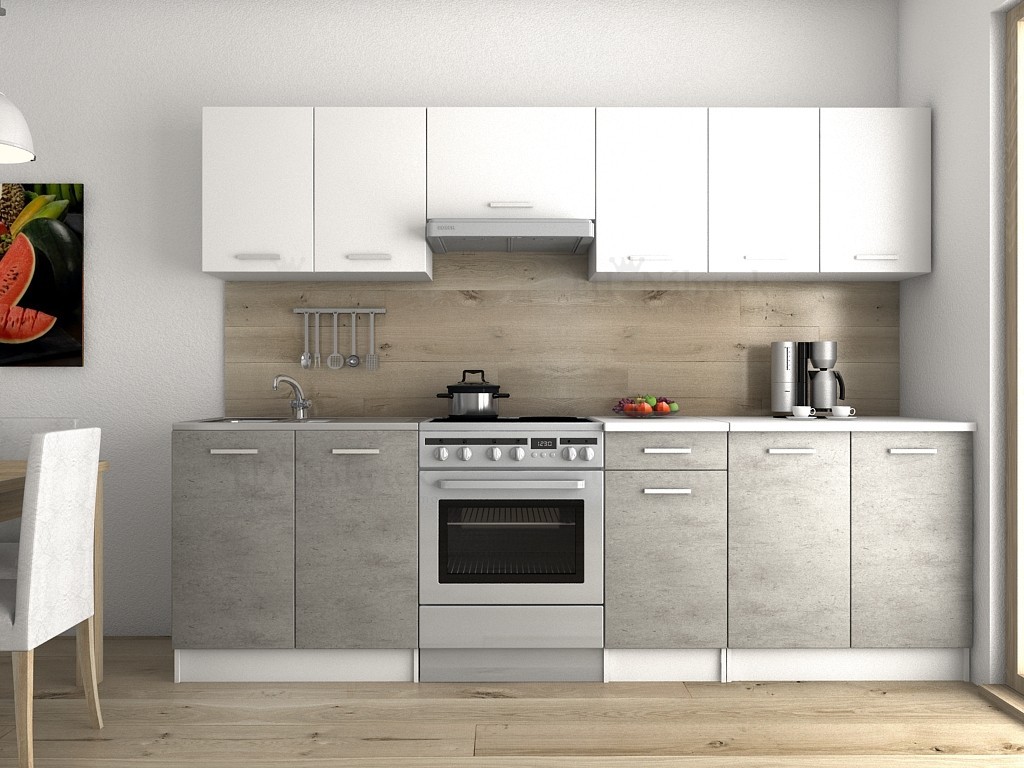 Moderní kuchyně vhodná i do panelákových bytů. Tato kuchyně je navržena tak, že skříňky se dají poskládat v libovolném pořadí. To vám umožní si sestavit kuchyni podle svých představ. Pracovní deska je dodávána v barvě bílá, která je dodávána vcelku 120cm (kromě skříňky na dřez). Korpus je v bílé barvě 18mm. Hrany jsou lemovány ABS páskou 0,6mm. Dvířka jsou vyrobena z kvalitní MDF 16 mm v barevném provedení bílá / beton. Sestava se skládá ze spodních skříněk - výška 82 (bez PD), hloubka 45, šířka 80/40/80 cm a vrchních skříněk - výška 58, hloubka 30, šířka 80/60/40/80 cm. Úchyty jsou plastové v šedé barvě. Spotřebiče, dřez a digestoř nejsou v ceně. Kuchyň nabízíme také v dalších barevných variantách, které naleznete níže na stránce. Možnost doobjednání dřezu. Dodáváme v demontovaném stavu.