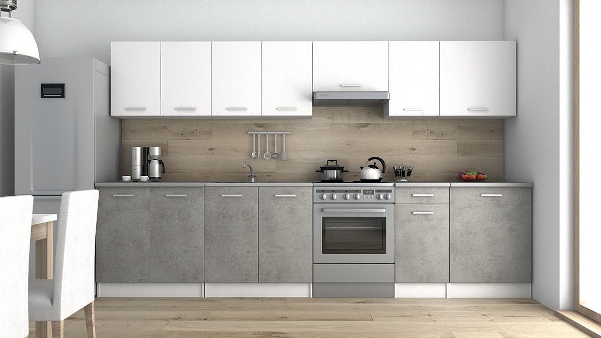 Moderní kuchyně vhodná i do panelákových bytů. Tato kuchyně je navržena tak, že skříňky se dají poskládat v libovolném pořadí. To vám umožní si sestavit kuchyni podle svých představ. Pracovní deska je dodávána v barvě bílá, která je dodávána vcelku 180cm (kromě skříňky na dřez). Korpus je v bílé barvě 18mm. Hrany jsou lemovány ABS páskou 0,6mm. Dvířka jsou vyrobena z kvalitní MDF 16 mm v barevném provedení bílá / beton. Sestava se skládá ze spodních skříněk - výška 82 (bez PD), hloubka 45, šířka 80/80/40/60 cm a vrchních skříněk - výška 58, hloubka 30, šířka 80/80/60/40/60 cm. Úchyty jsou plastové v šedé barvě. Spotřebiče, dřez a digestoř nejsou v ceně. Kuchyň nabízíme také v dalších barevných variantách, které naleznete níže na stránce. Možnost doobjednání dřezu. Dodáváme v demontovaném stavu.