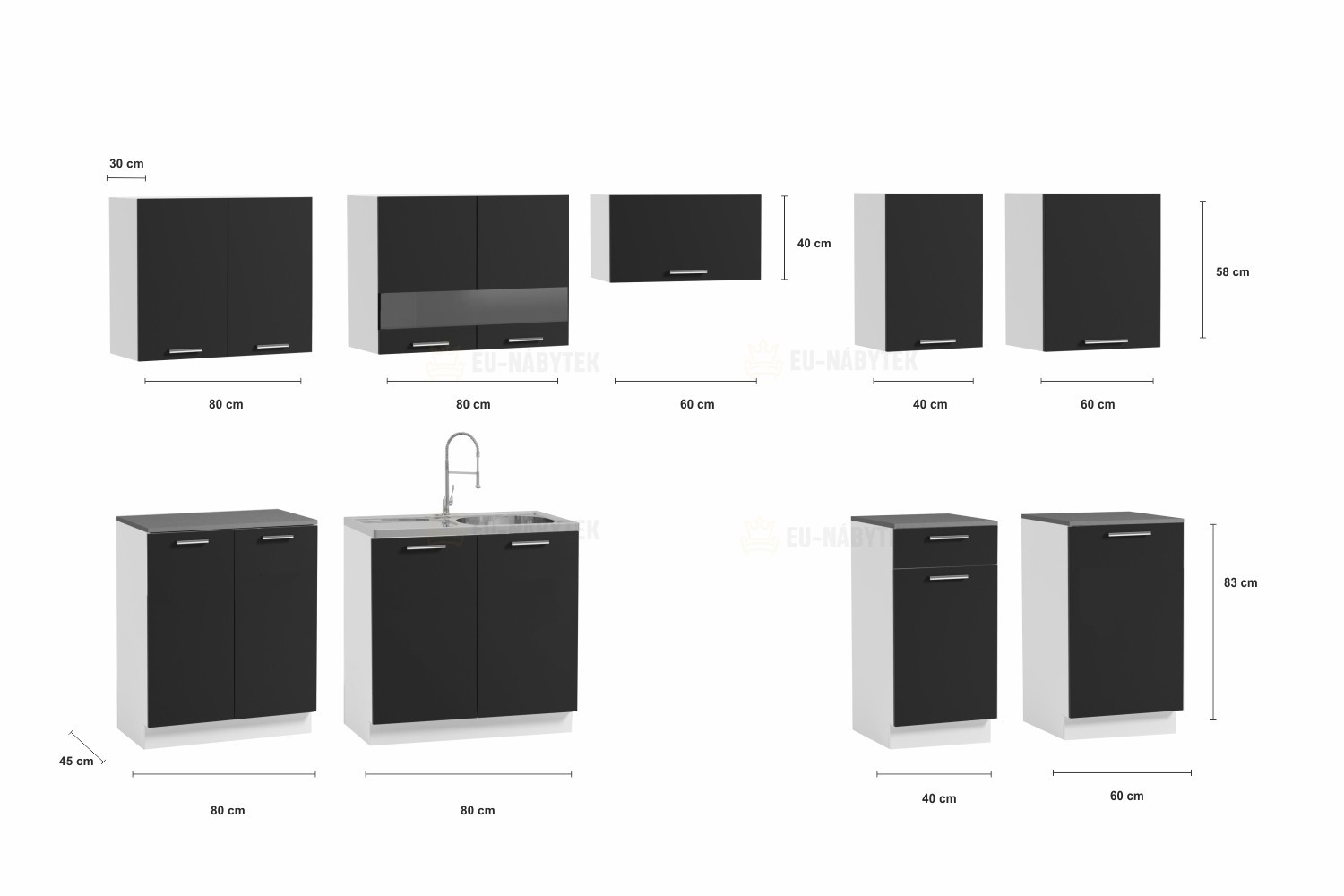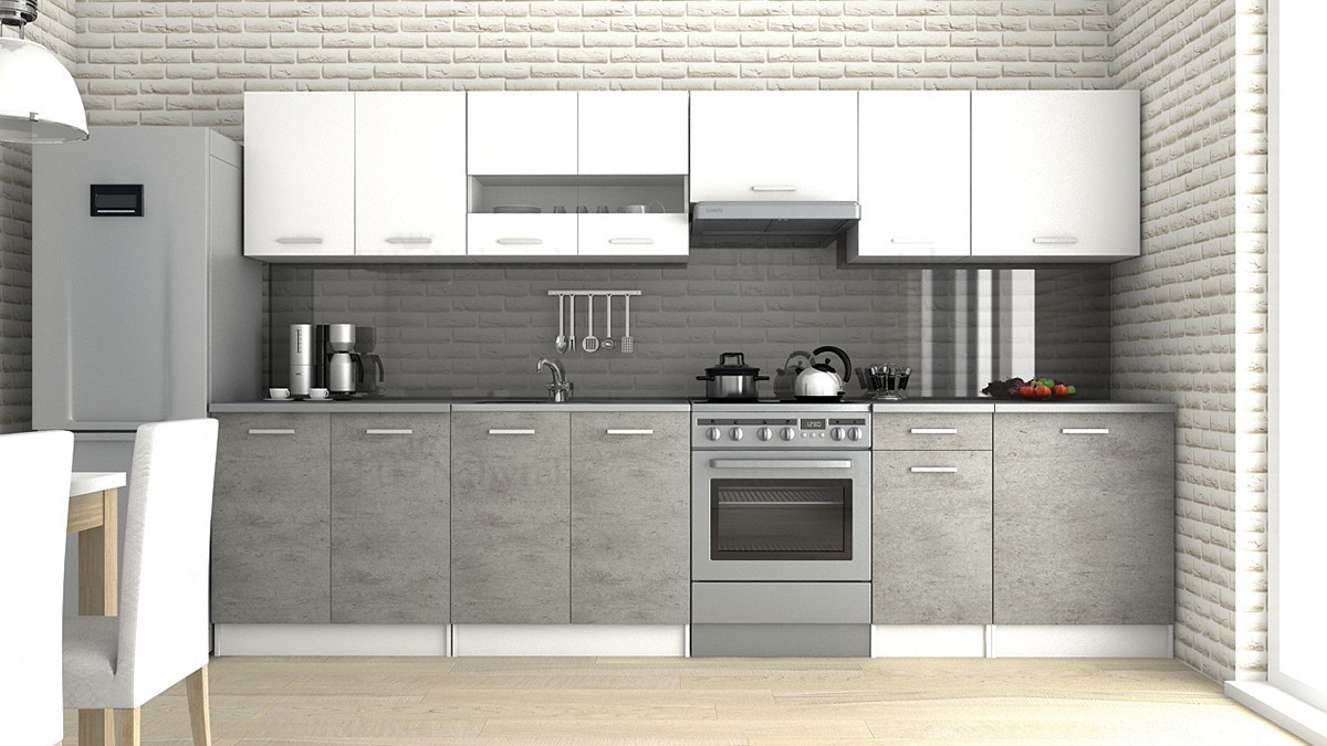 Moderní kuchyně vhodná i do panelákových bytů. Tato kuchyně je navržena tak, že skříňky se dají poskládat v libovolném pořadí. To vám umožní si sestavit kuchyni podle svých představ. Pracovní deska je dodávána v barvě bílá, která je dodávána vcelku 180cm (kromě skříňky na dřez). Korpus je v bílé barvě 18mm. Hrany jsou lemovány ABS páskou 0,6mm. Dvířka jsou vyrobena z kvalitní MDF 16 mm v barevném provedení bílá / beton. Sestava se skládá ze spodních skříněk - výška 82 (bez PD), hloubka 45, šířka 80/80/40/60 cm a vrchních skříněk - výška 58, hloubka 30, šířka 80/80/60/40/60 cm. Úchyty jsou plastové v šedé barvě. Spotřebiče, dřez a digestoř nejsou v ceně. Kuchyň nabízíme také v dalších barevných variantách, které naleznete níže na stránce. Možnost doobjednání dřezu. Dodáváme v demontovaném stavu.