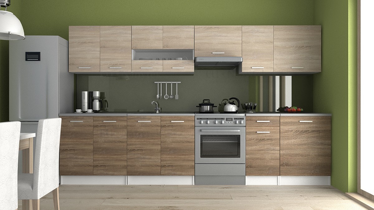 Moderní kuchyně vhodná i do panelákových bytů. Tato kuchyně je navržena tak, že skříňky se dají poskládat v libovolném pořadí. To vám umožní si sestavit kuchyni podle svých představ. Pracovní deska je dodávána v barvě bílá, která je dodávána vcelku 180cm (kromě skříňky na dřez). Korpus je v bílé barvě 18mm. Hrany jsou lemovány ABS páskou 0,6mm. Dvířka jsou vyrobena z kvalitní MDF 16 mm v barevném provedení dub sonoma / tobacco. Sestava se skládá ze spodních skříněk - výška 82 (bez PD), hloubka 45, šířka 80/80/40/60 cm a vrchních skříněk - výška 58, hloubka 30, šířka 80/80/60/40/60 cm. Úchyty jsou plastové v šedé barvě. Spotřebiče, dřez a digestoř nejsou v ceně. Kuchyň nabízíme také v dalších barevných variantách, které naleznete níže na stránce. Možnost doobjednání dřezu. Dodáváme v demontovaném stavu.