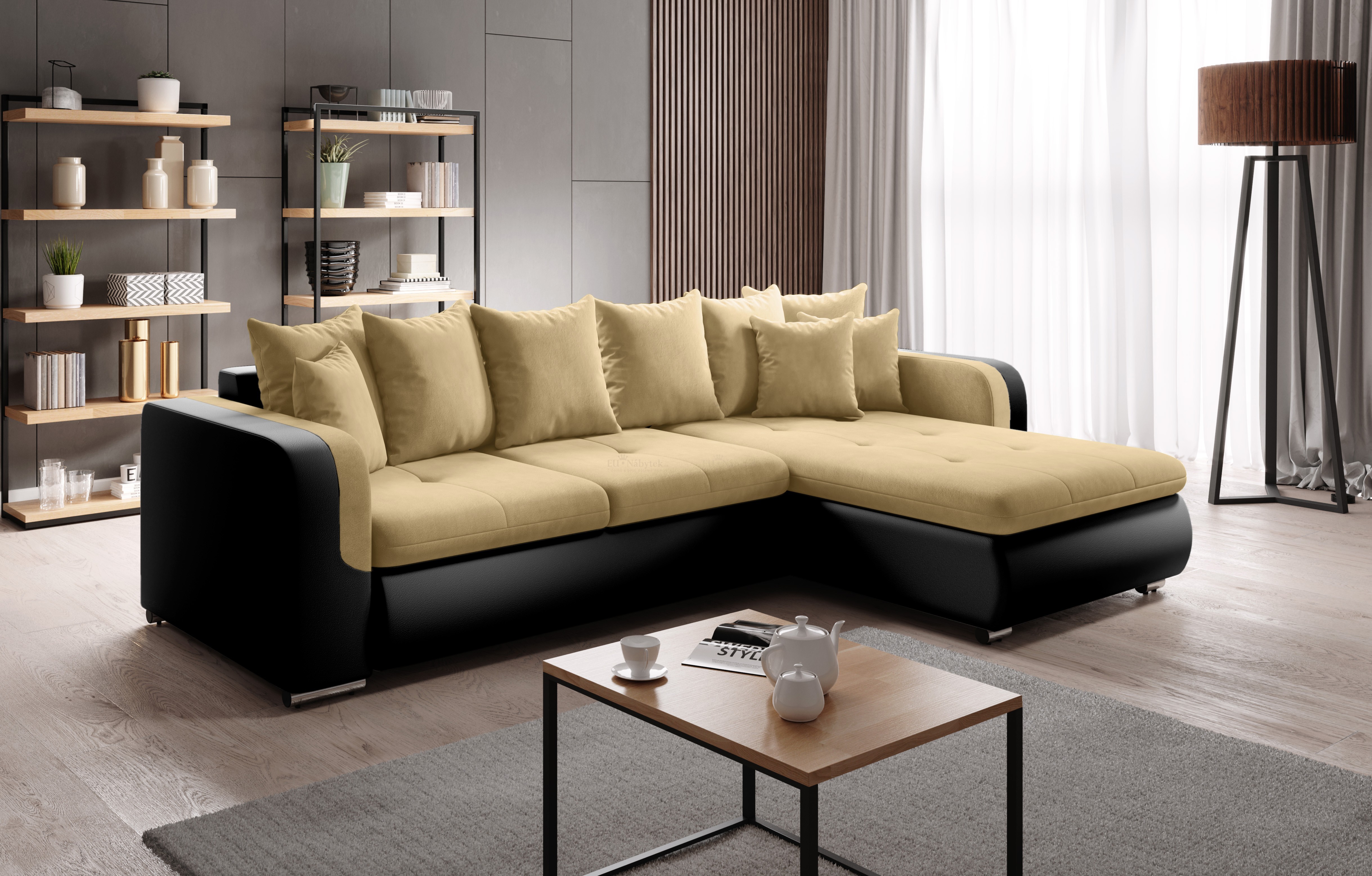 Sedací souprava Frodos je ideální pro ty, kteří ocení komfort a pohodlí. Tkanina vysoké kvality, masivní pevná kostra, pružinové jádro faliste s kvalitní PUR pěnou T30 zaručují komfortní posezení. Praktické jsou polštáře, které mají potah na zip. Plocha po rozložení je 230x135 cm. Hloubka sedu bez polštářů 63cm, s polštáři 48cm, výška bez polštářů 65cm. Nožky jsou z kovu v barvě chrom. Sedačka je celočalouněná, vhodná do prostoru. Nemá úložný prostor. Barevné provedení - Milo 4 a ekokůže Madryt 124. V nabídce i jiném barevném provedení. Nutno přešroubovat spojovací materiál v případě opačného rohu.