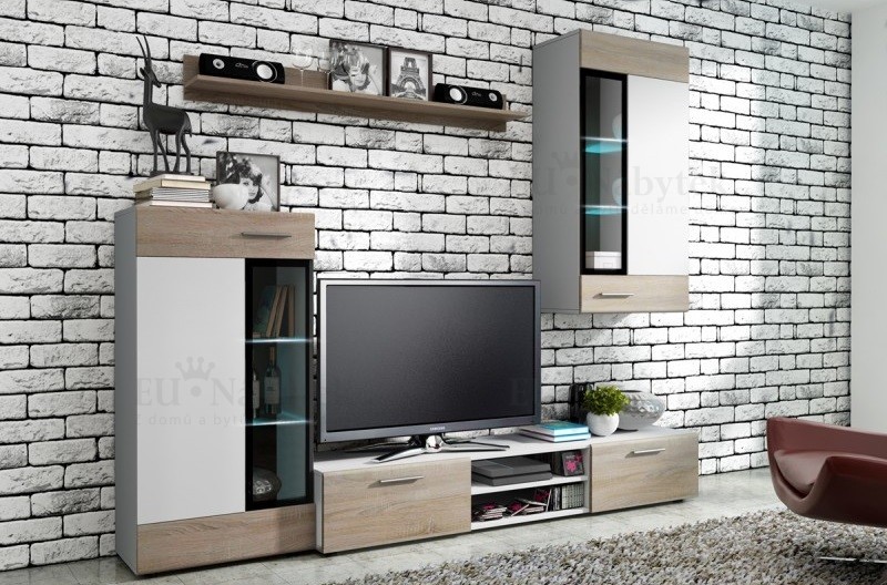 Moderní obývací stěna, která si zakládá na nejnovějších trendech bydlení. Nábytek je vyroben z kvalitního lamina. Sestava se skládá z (šířka/hloubka/výška) - TV stolek (176 x 40 x 28 cm), dolní vitrína (60 x 34 x 117 cm), horní vitrína (60 x 34 x 115 cm) a police (138 x 18 x 16 cm). Korpus je bílý, dvířka jsou v barvě dub sonoma / bílá. Tato stěna se prodává jako sestava, jednotlivé díly nelze koupit zvlášť. Ve vitrínách jsou skleněné police. LED osvětlení není v ceně, možnost dokoupení. Dodáváme v demontovaném stavu. Níže na stránce naleznete další barevné varianty.