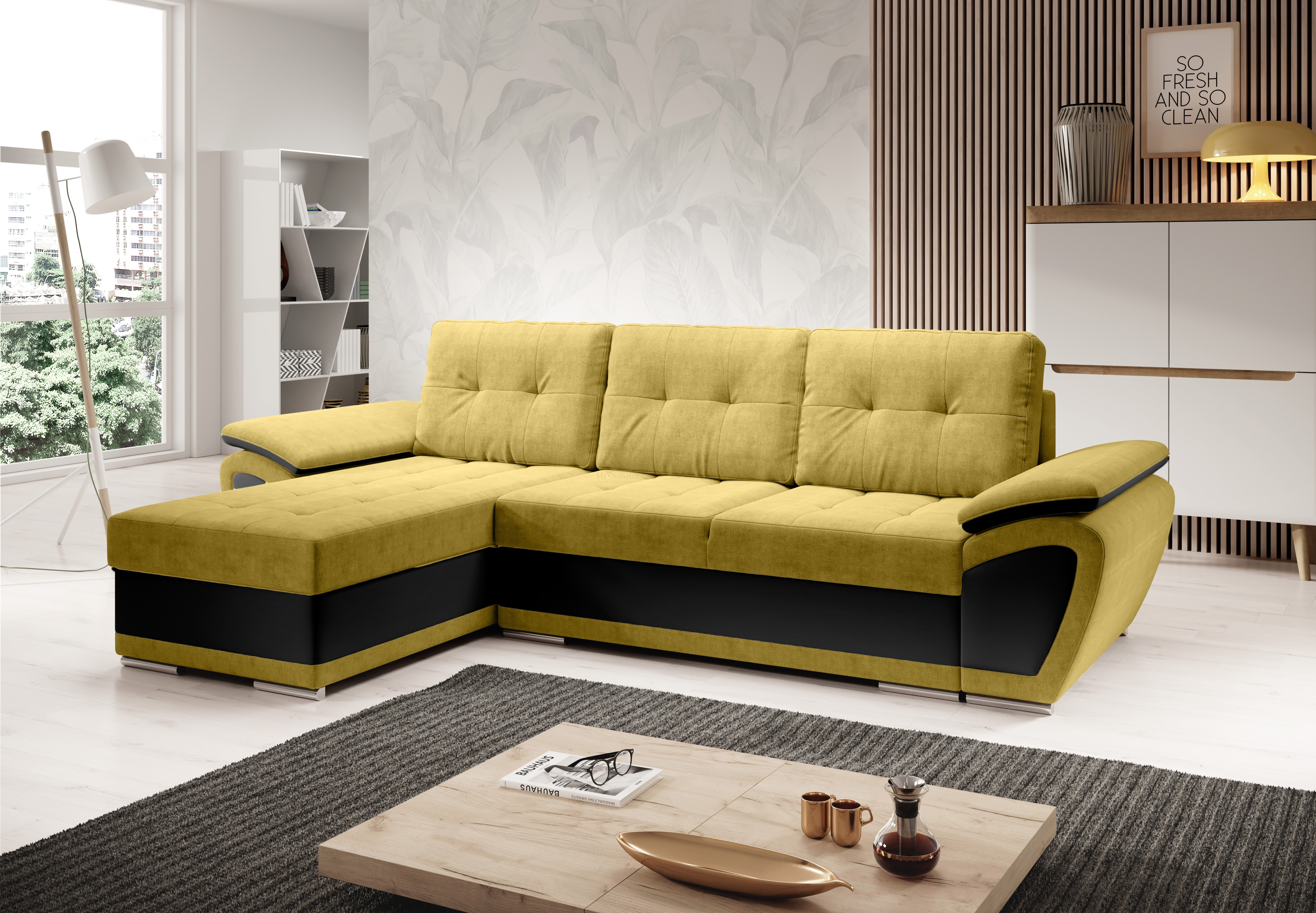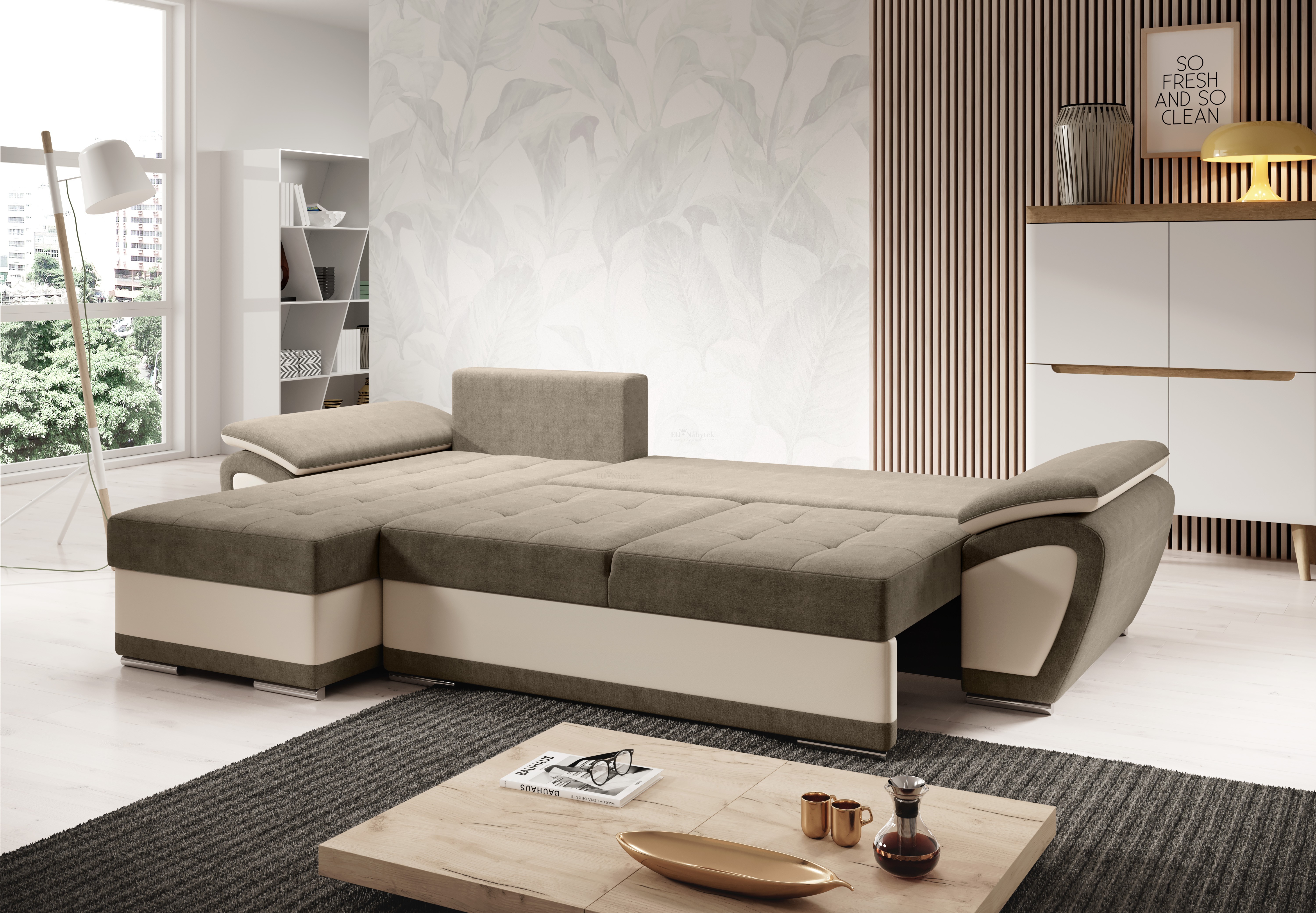 Rozkládací rohová sedačka Erdorado je ideální pro ty, kteří ocení komfort a pohodlí. Tkanina vysoké kvality, masivní pevná kostra, pružinové jádro Faliste s kvalitní PUR pěnou T28 zaručují komfortní posezení. Sedačka disponuje také úložným prostorem, který naleznete po rozložení v hlavní části sedačky. Plocha po rozložení je 218x116cm. Nožky jsou z kovu v barvě chrom. Sedačka je celočalouněná, vhodná do prostoru. Rozměr polštáře 50x67cm, hloubka sedu s polštáři 45cm, hloubka sedu bez polštáře 69cm, výška sedu 39cm. Kombinace barev - Orinoco 24 a ekokůže Madryt 112. V nabídce v mnoha dalších barvách.