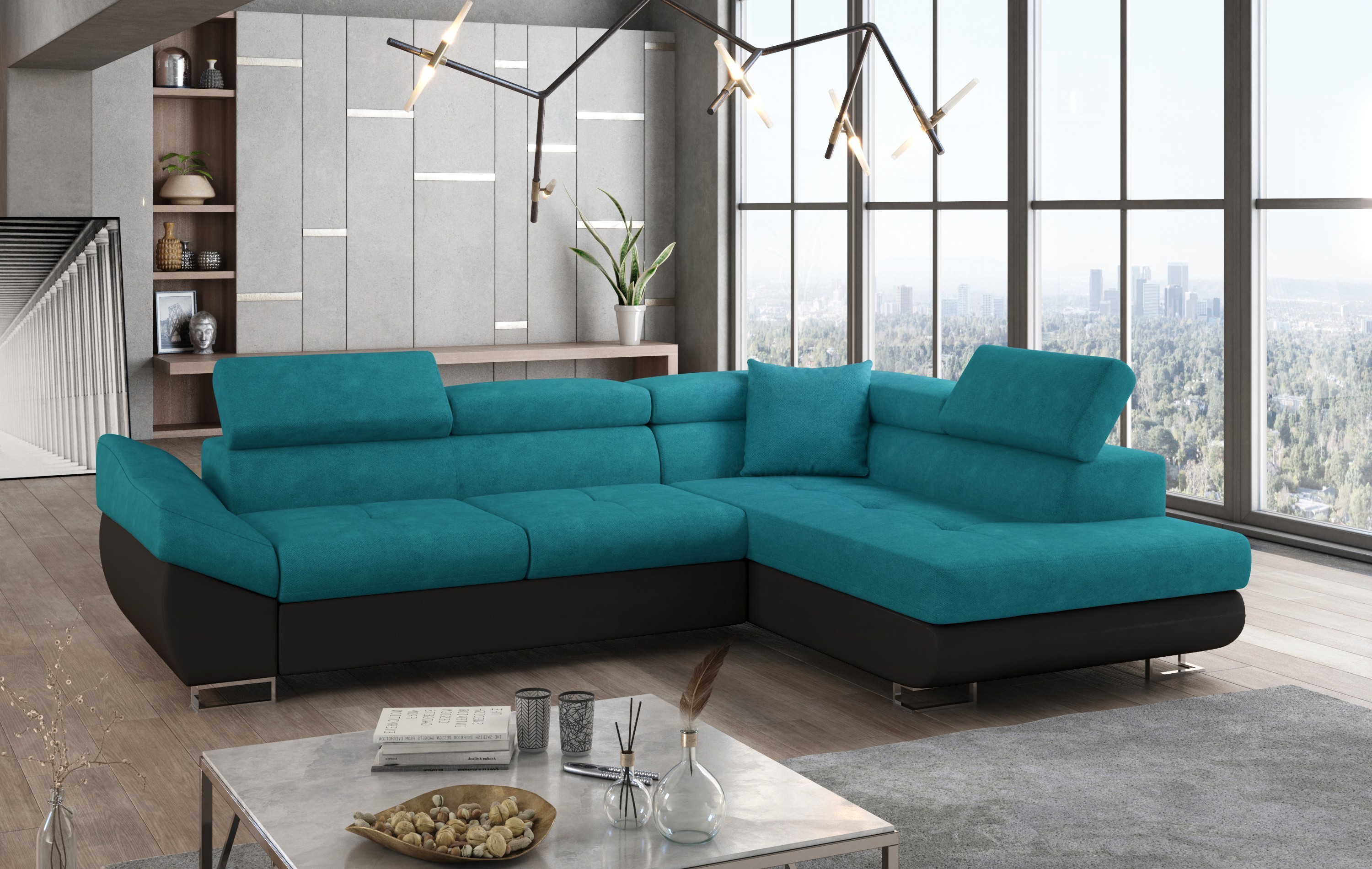 Rohová sedací souprava Lyon je ideální pro ty, kteří ocení komfort a pohodlí. Její moderní vzhled bude dominancí každého obývacího pokoje. Tkanina vysoké kvality, masivní pevná kostra, pružinové jádro s kvalitní pěnou T30 zaručují komfortní sezení. Sedací souprava je včetně úložného prostoru, který se nachází v boční části sedačky. Velkou předností této sedačky jsou tři polohovatelné záhlavníky. Jednoduchým manuálním polohováním opěrky hlavy si zvýšíte komfort sezení. Spací část nemusí být čalouněná stejnou látkou jako je sezení. Na našich stránkách naleznete další barevné varianty.