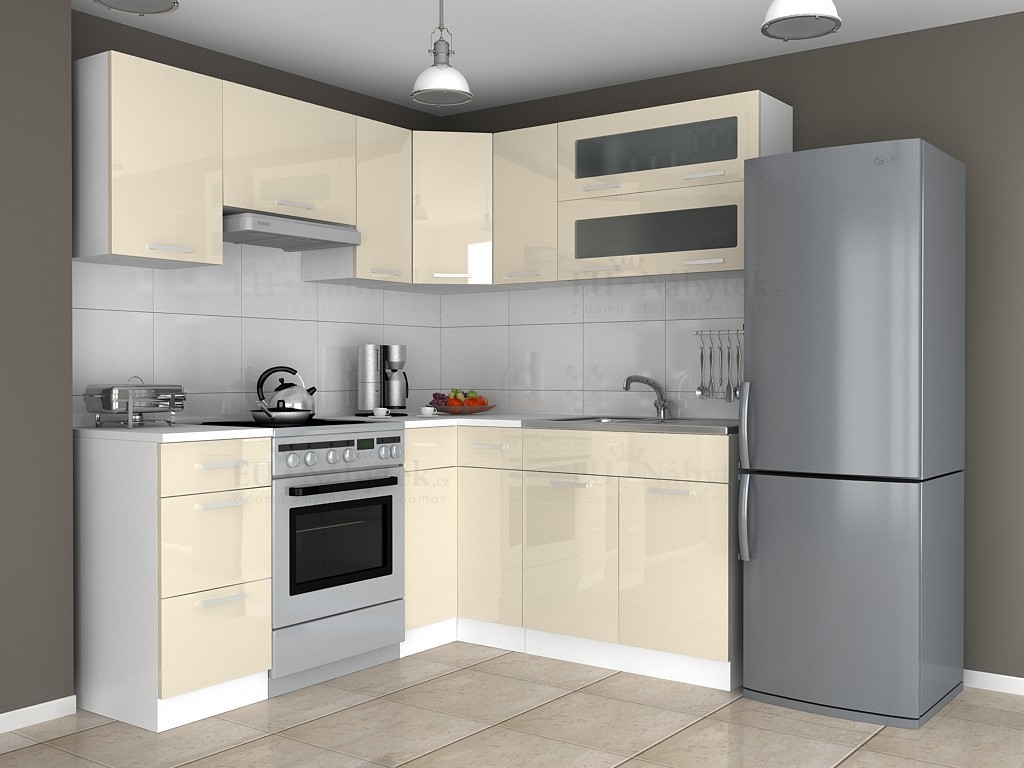 Luxusní rohová kuchyňská linka vhodná i do panelákových bytů. Tato kuchyně je navržena tak, že skříňky se dají poskládat v libovolném pořadí. To Vám umožní si sestavit kuchyni podle svých představ. Pracovní deska je v ceně, která je dodávána 40cm, 90cm a 30cm (kromě skříňky na dřez a trouby). Sokl i korpus jsou v bílé barvě z kvalitní MDF 18mm, dvířka jsou ve vysokém lesku 16mm. Sestava se skládá ze spodních skříněk - výška 82 (včetně soklu bez PD), hloubka 45, šířka 40/rohová 90x90/dřezová 80cm a vrchních skříněk - výška 58, hloubka 30, šířka 40/digestořová 60/30/rohová 60x60/30/80 cm. Úchyty jsou plastové a mají šedou barvu. Spotřebiče, dřez a digestoř v ceně nejsou. Možnost doobjednání dřezu. Dodáváme v demontovaném stavu. Dvířka jsou v barvě vanilka v lesku.Pracovní deska je dodávaná v barvě Titan.