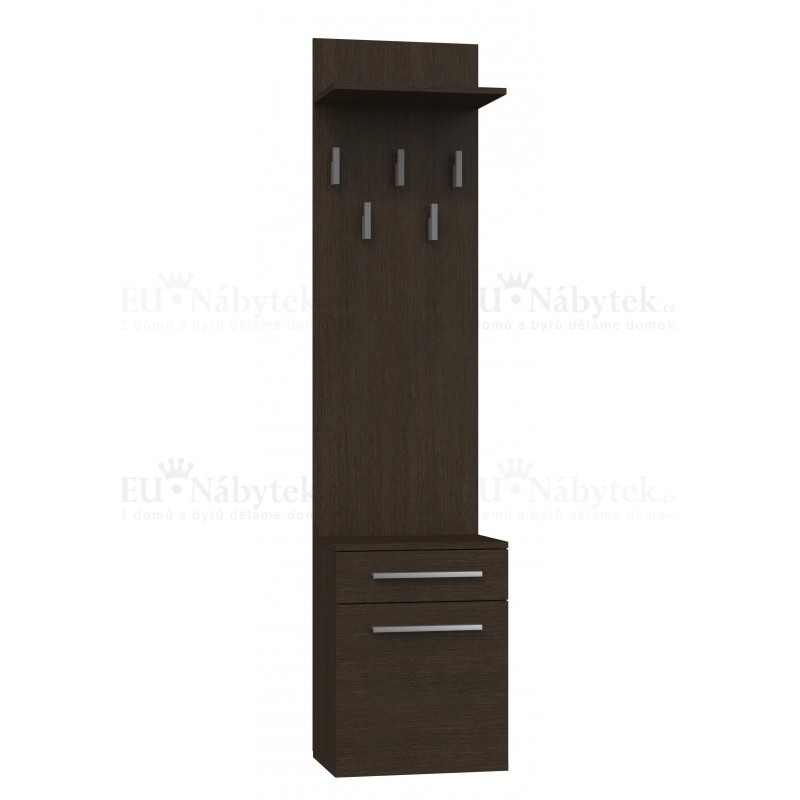 Věšáková sestava vyrobena z kvalitního lamina 16 mm, která disponuje pěti věšáky, praktickou policí, botníkem a šuplíkem. Rozměry botníku (šxvxh) 50x57x35cm, rozměry věšáku s policí (šxvxh) 50x124x27cm. V nabídce i v jiném barevném provedení, které naleznete níže na stránce.