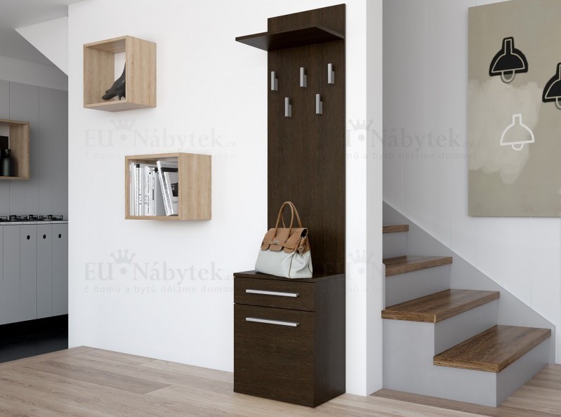Věšáková sestava vyrobena z kvalitního lamina 16 mm, která disponuje pěti věšáky, praktickou policí, botníkem a šuplíkem. Rozměry botníku (šxvxh) 50x57x35cm, rozměry věšáku s policí (šxvxh) 50x124x27cm. V nabídce i v jiném barevném provedení, které naleznete níže na stránce.