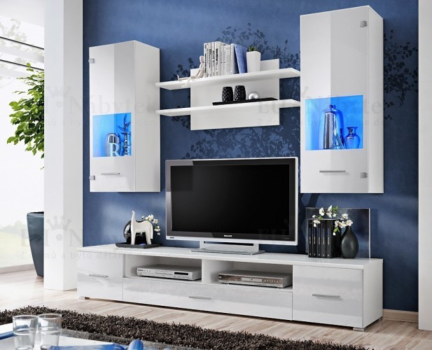 Obývací stěna Rennie zdůrazňuje unikátní design nábytku. Stylová kompozice moderního nábytku zaručuje nejen reprezentativní zařízení daného interiéru, ale také i vysokou funkčnost, kterou ocení dokonce i nejnáročnější zákazníci. Spojení bílé matné barvy korpusu s bílým leskem viditelným na RTV stolku a závěsných vitrínách obohatí užitnou plochu a zároveň rozzáří její celý prostor. Doplněním celé kompozice je LED osvětlení, které zdůrazňuje moderní styl v interiérovém designu. Dodáváme v demontu. Níže na stránce naleznete další barevné varianty.