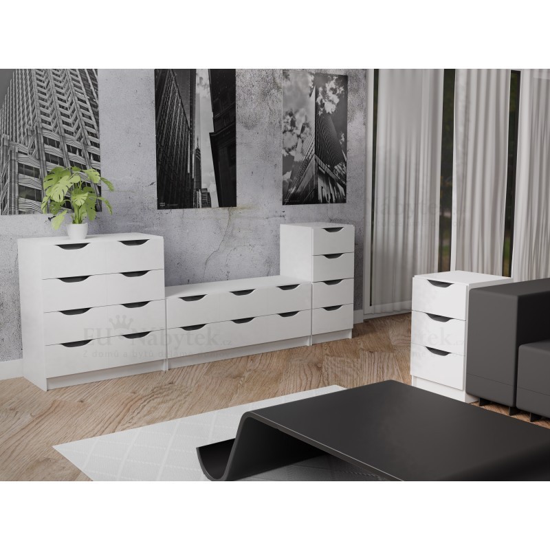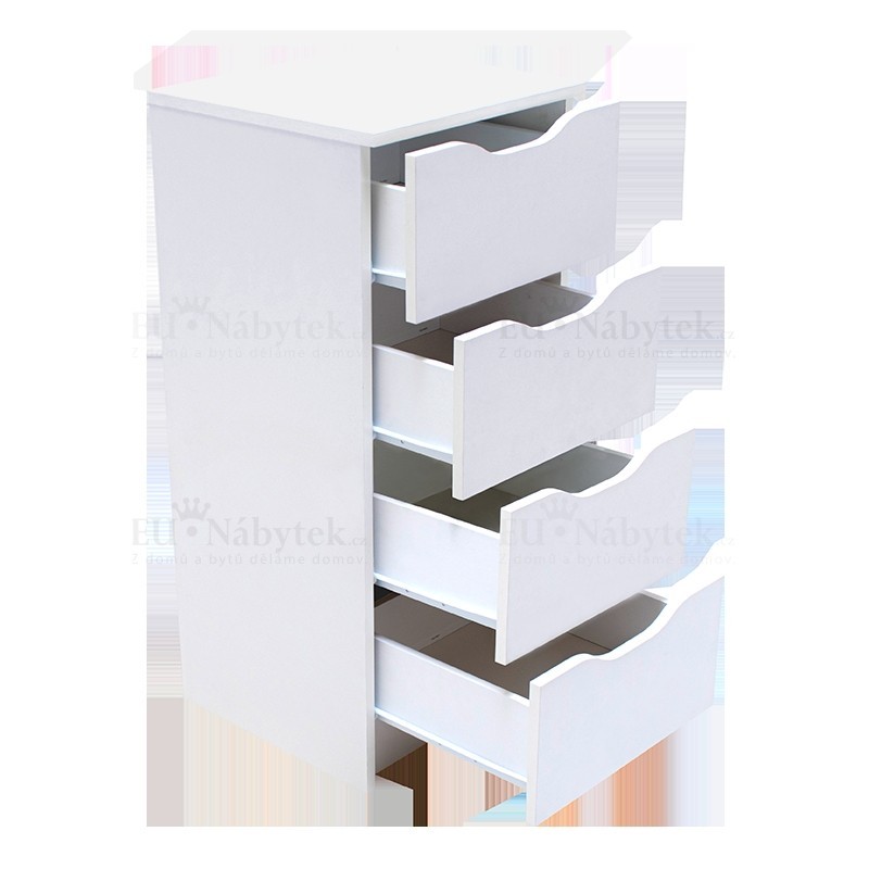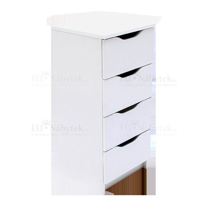 Komoda ALEXIS vhodná do ložnice, obývacího pokoje i kanceláře, která disponuje čtyřmi šuplíky. Tato komoda je vyrobena z kvalitní LTD. Hrany jsou lemovány ABS páskou. Zaručuje tak dlouhou životnost produktu. Rozměry jsou (šxhxv) 40x40x92cm. V barevném provedení bílá. Níže na stránce naleznete další produkty z této kolekce. Dodáváno v demontu.