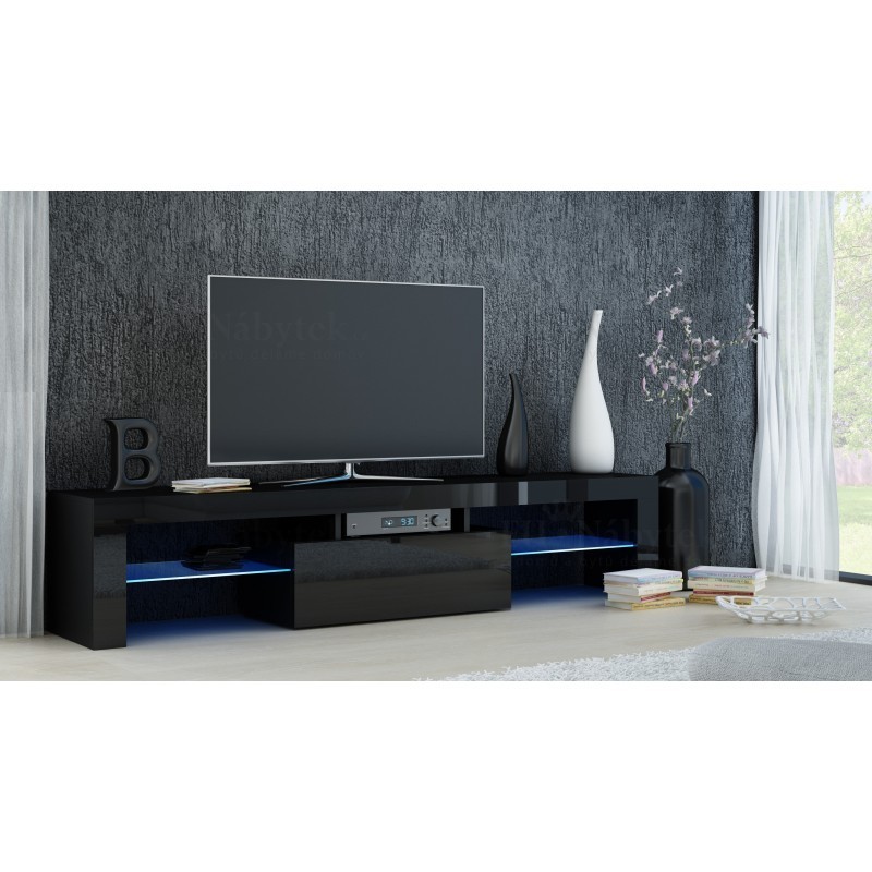 Praktický moderní RTV stolek v provedení černá lesk (dvířka). Vyroben je z kvalitní MDF - dvířka 17mm, korpus 16mm. Praktické jsou dvě skleněné poličky a další prostor pro uložení. Rozměry (ŠxVxH) 160x45x40cm. Dodáváno v demontovaném stavu.