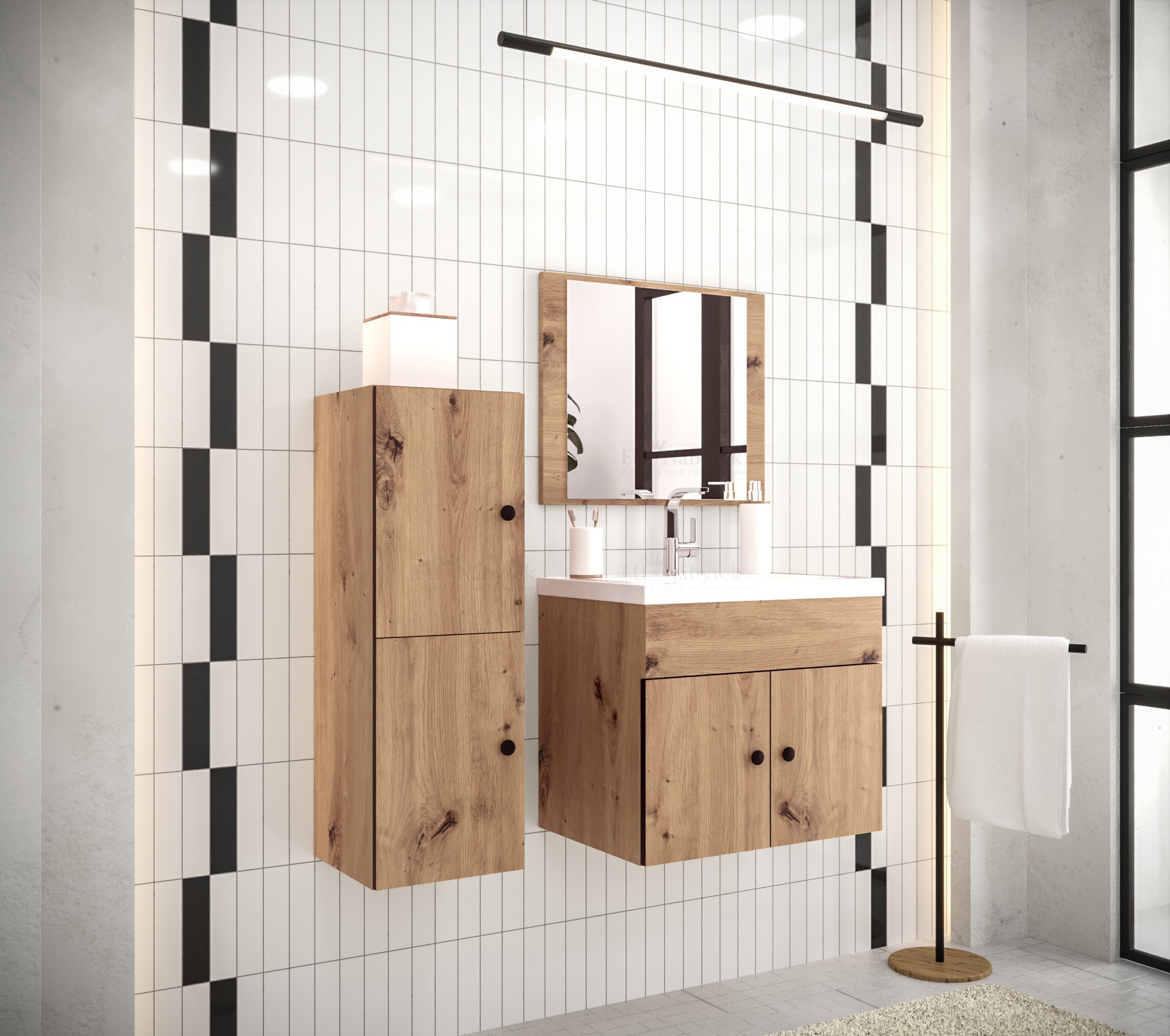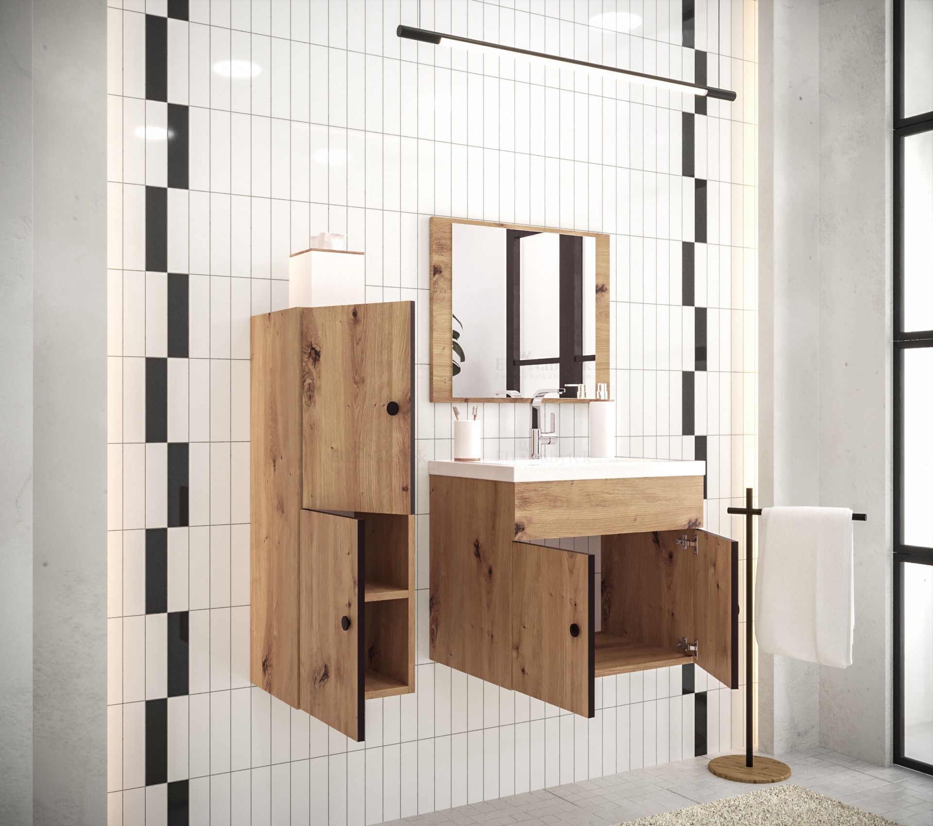 Moderní závěsná koupelnová sestava KAROL vytvoří jedinečný design. Součástí sestavy: 1x sloupek, skříň pod umyvadlo, panel se zrcadlem. Vyrobeno z kvalitního lamina, zadní část nábytku je z HDF desky a skříňka pro umyvadlo je zezadu otevřená. Všechny hrany jsou zakončeny odolnou PVC dýhou proti každodennímu poškození a ochranou před vlhkostí. Možnost více sestavení dveří u sloupku při montáži. Umyvadlo není v ceně, lze dokoupit. Koupelnovou sestavu nabízíme ve více variantách, vše naleznete níže na stránce. Barevné provedení: dub artisan, černá mat, černá madla.