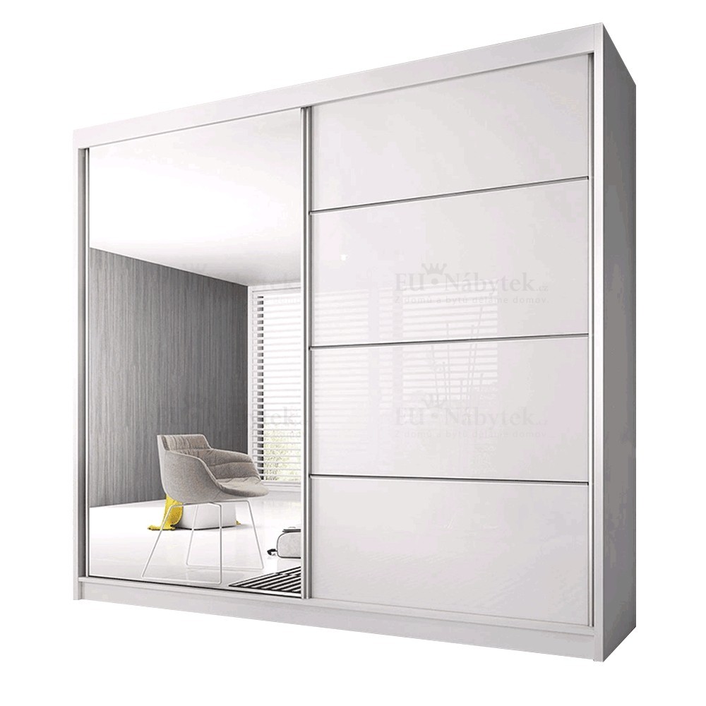 Šatní skříň s posuvnými dveřmi, MULTI 35 Materiál: DTD laminovaná / ABS hrany / zrcadlo Barva: bílá Barva dveří: bílá extra vysoký lesk Rozměry (ŠxHxV): 183x61x218 cm Tloušťka materiálu: 16 mm Levá část policová V pravé části věšáková tyč a police Kovové pojezdy na ložiskových kolečkách, systém…