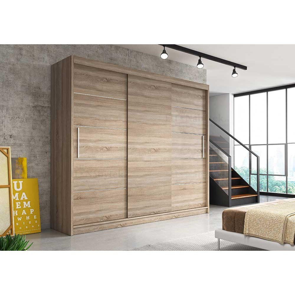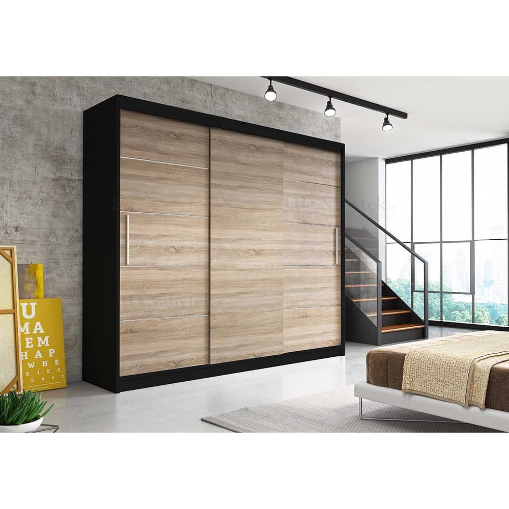 Moderní šatní skříň Albina o rozměru (šxvxh) 250x218x61cm v barevném provedení korpus černá, dveře bílá. Tato prostorná skříň vám nabízí spoustu úložného prostoru včetně šatní tyče na pověšení kabátů. Skříň tak využije celá rodina. Luxusní dojem dodávají designové posuvné dveře. Skříň se hodí do ložnice, chodby i dětského pokoje. Vyrobena je z laminované desky o síle 16mm. Hrany jsou lemovány páskou ABS, díky čemuž vám skříň nabízí dlouhou životnost, odolnost proti poškození. Dodáváno v demontu. Výrobce ji nabízí v několika barevných variantách, které naleznete níže na stránce.