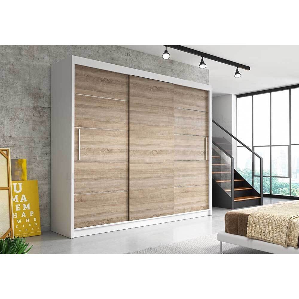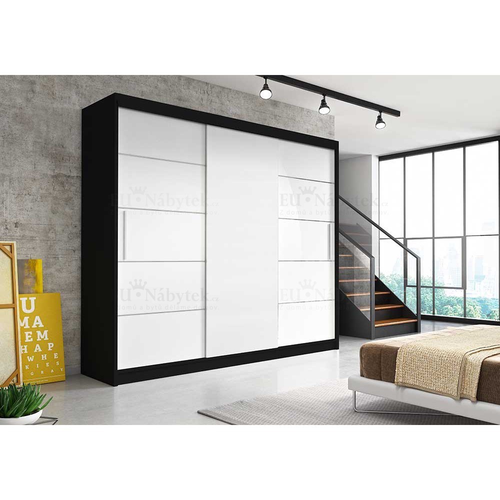 Moderní šatní skříň Albina o rozměru (šxvxh) 250x218x61cm v barevném provedení korpus černá, dveře dub sonoma. Tato prostorná skříň vám nabízí spoustu úložného prostoru včetně šatní tyče na pověšení kabátů. Skříň tak využije celá rodina. Luxusní dojem dodávají designové posuvné dveře. Skříň se hodí do ložnice, chodby i dětského pokoje. Vyrobena je z laminované desky o síle 16mm. Hrany jsou lemovány páskou ABS, díky čemuž vám skříň nabízí dlouhou životnost, odolnost proti poškození. Dodáváno v demontu. Výrobce ji nabízí v několika barevných variantách, které naleznete níže na stránce.