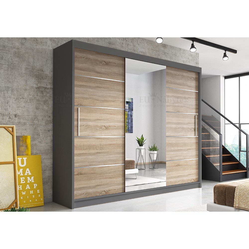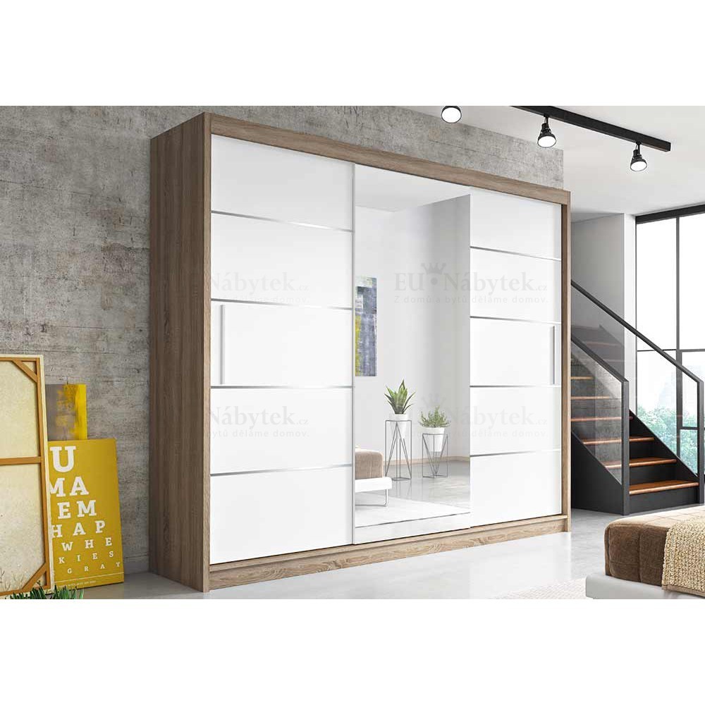 Moderní šatní skříň Astrida o rozměru (šxvxh) 233x218x61cm v barevném provedení korpus dub sonoma, dveře bílá. Tato prostorná skříň vám nabízí spoustu úložného prostoru včetně dvou šatních tyčí na pověšení kabátů. Skříň tak využije celá rodina. Luxusní dojem dodávají designové posuvné dveře včetně zrcadla, které vám opticky zvětší místnost. Skříň se hodí do ložnice, chodby i dětského pokoje. Vyrobena je z laminované desky o síle 16mm. Hrany jsou lemovány páskou ABS, díky čemuž vám skříň nabízí dlouhou životnost, odolnost proti poškození. Úchyty jsou hliníkové. Dodáváno v demontu. Výrobce ji nabízí v několika barevných variantách, které naleznete níže na stránce.