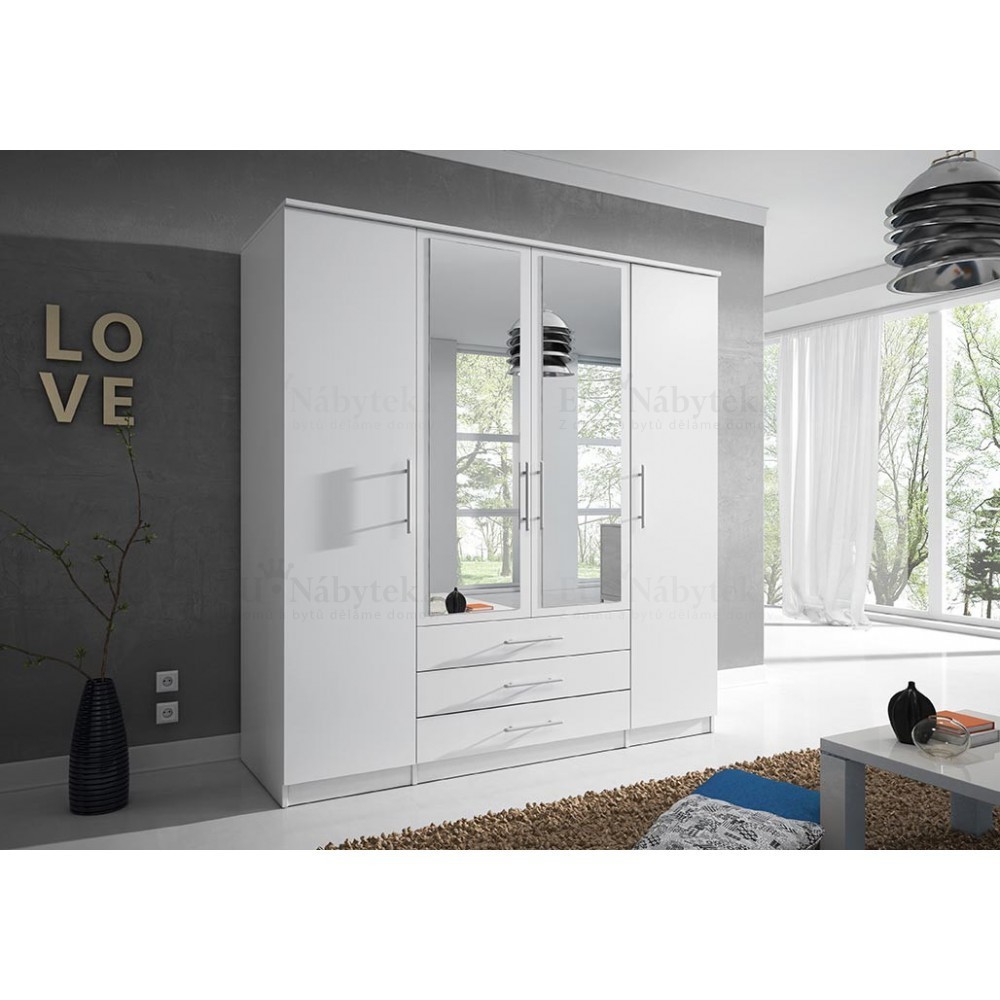 Šatní skříň SANTI v barevném provedení bílá se vyznačuje praktickým úložným prostorem a velkou kapacitou. V prostorném interiéru naleznete optimální počet polic a šatní tyč pro zavěšení oblečení. Skříň je navíc vybavena třemi praktickými zásuvkami. Velmi praktické je zrcadlo, které opticky zvětší prostor. Skříň můžete umístit v ložnici, chodbě i dětském pokoji. Vyrobena je z kvalitní LTD o síle 16mm. Hrany jsou lemovány ABS páskou, které zaručují dlouhou životnost. Rukojeti jsou plastové. Celkové rozměry jsou 200x210x64cm. Dodáváno v demontu.