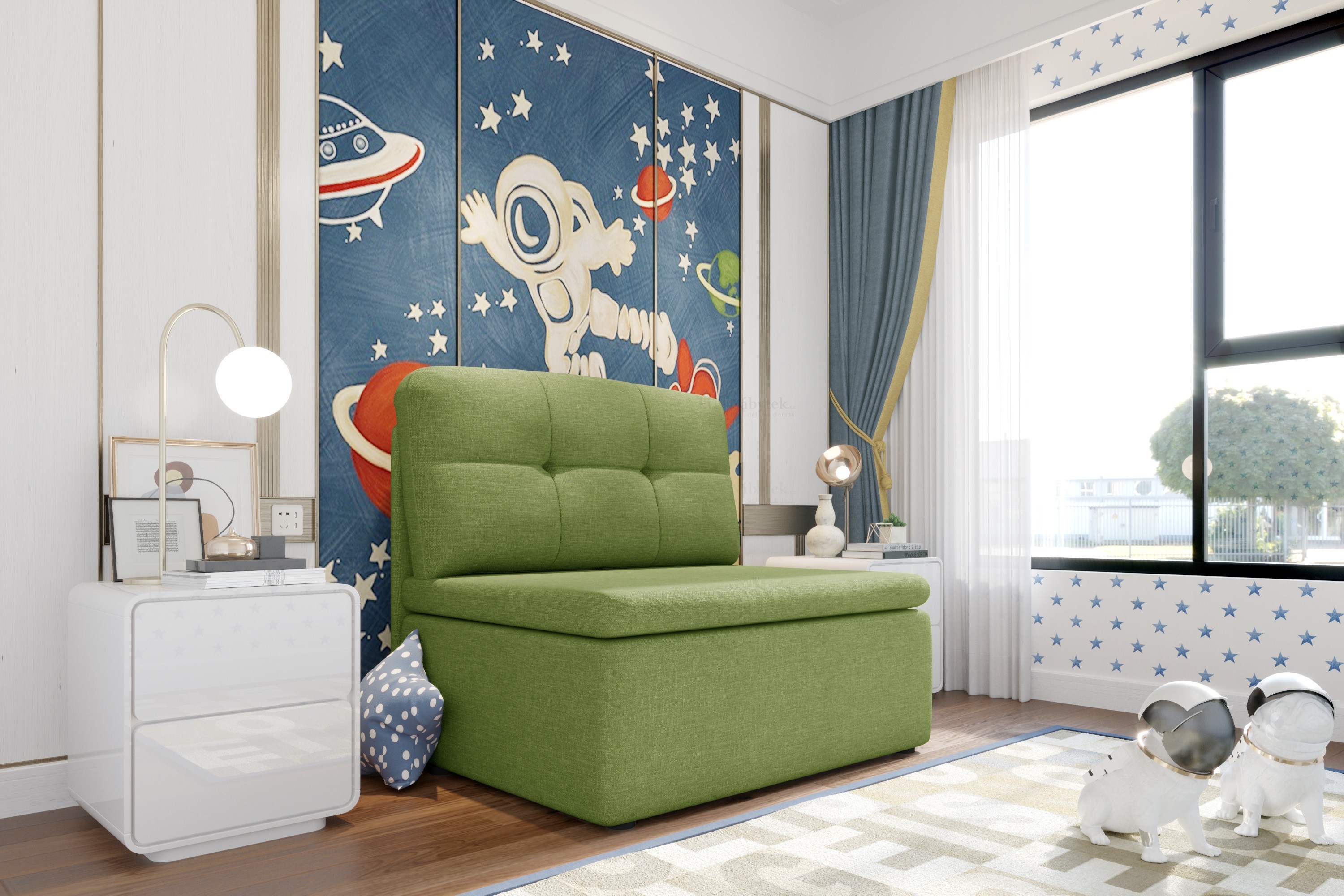 Rozkládací křeslo Hubert , které díky svému designu výborně zapadne do konceptu dětských pokojů, ale i například obývacího pokoje či menšího pokoje pro hosty. Díky praktickému rozkladu vám křeslo umožňuje pohodlné přespání jedné osoby. Plocha pro rozložení je 180x100cm. Celkové rozměry jsou 101x83x82cm. Čalouněné je látkou Sawana 35. V nabídce ve spoustě dalších barevných provedeních. Fota rozkladu jsou ilustrační.