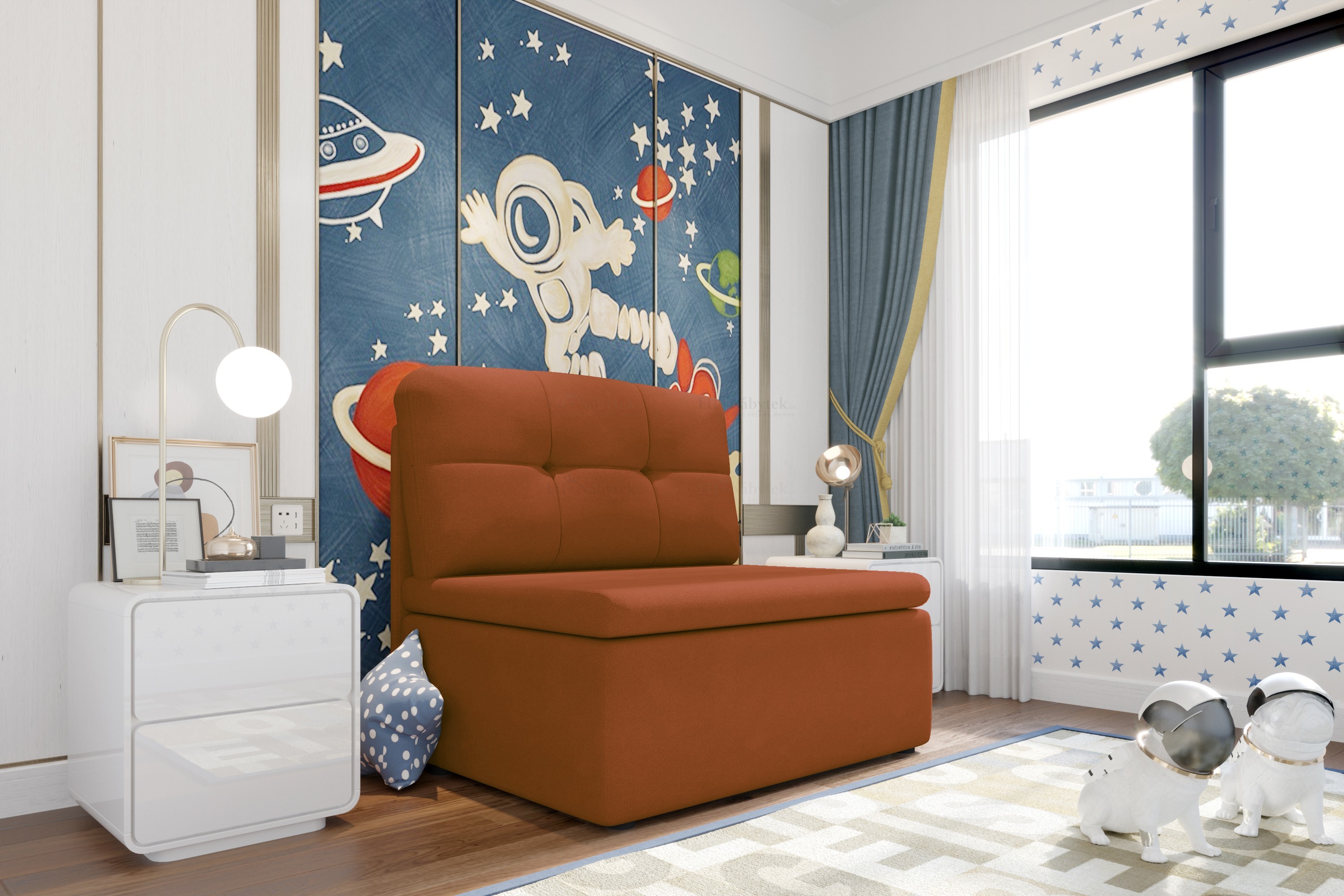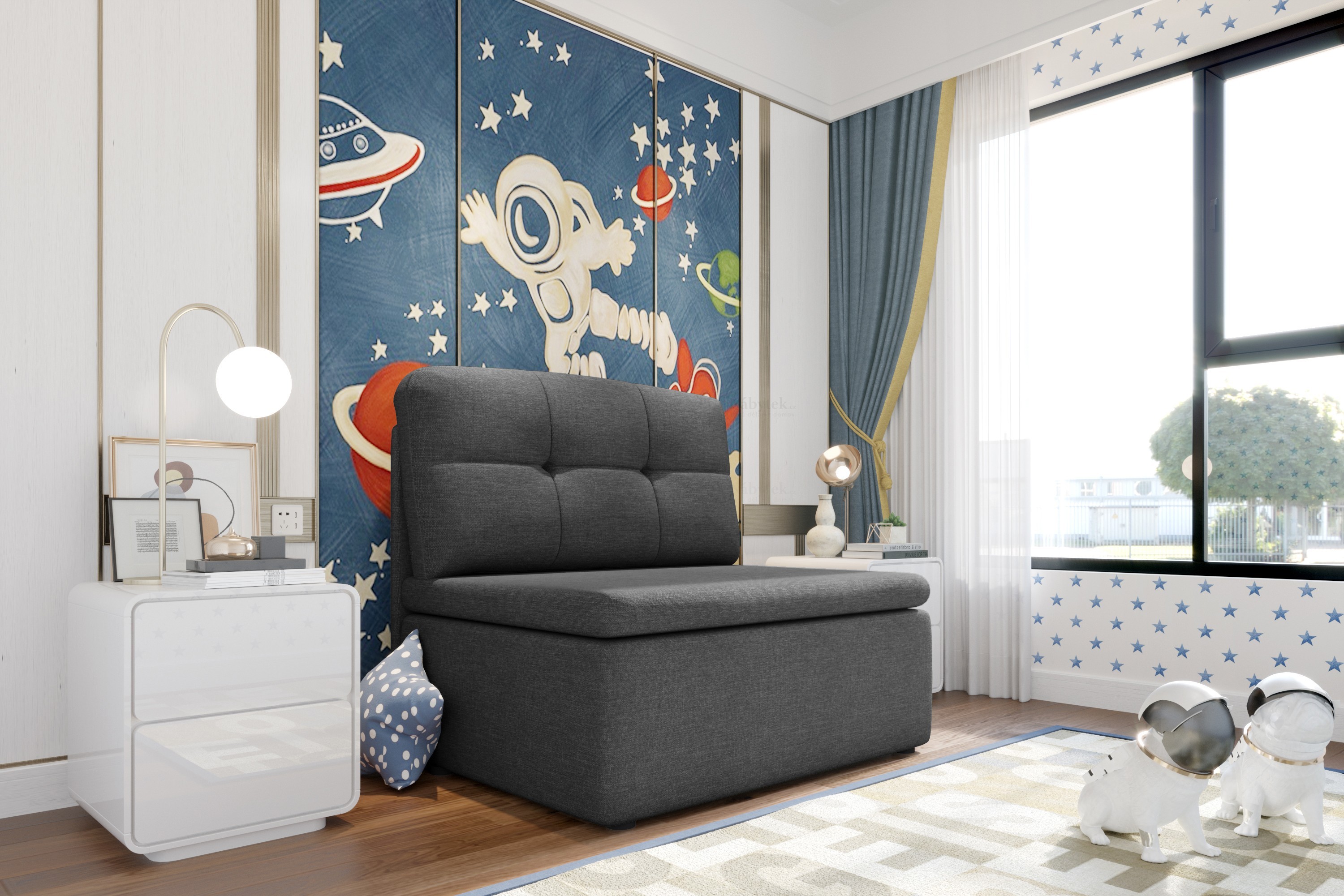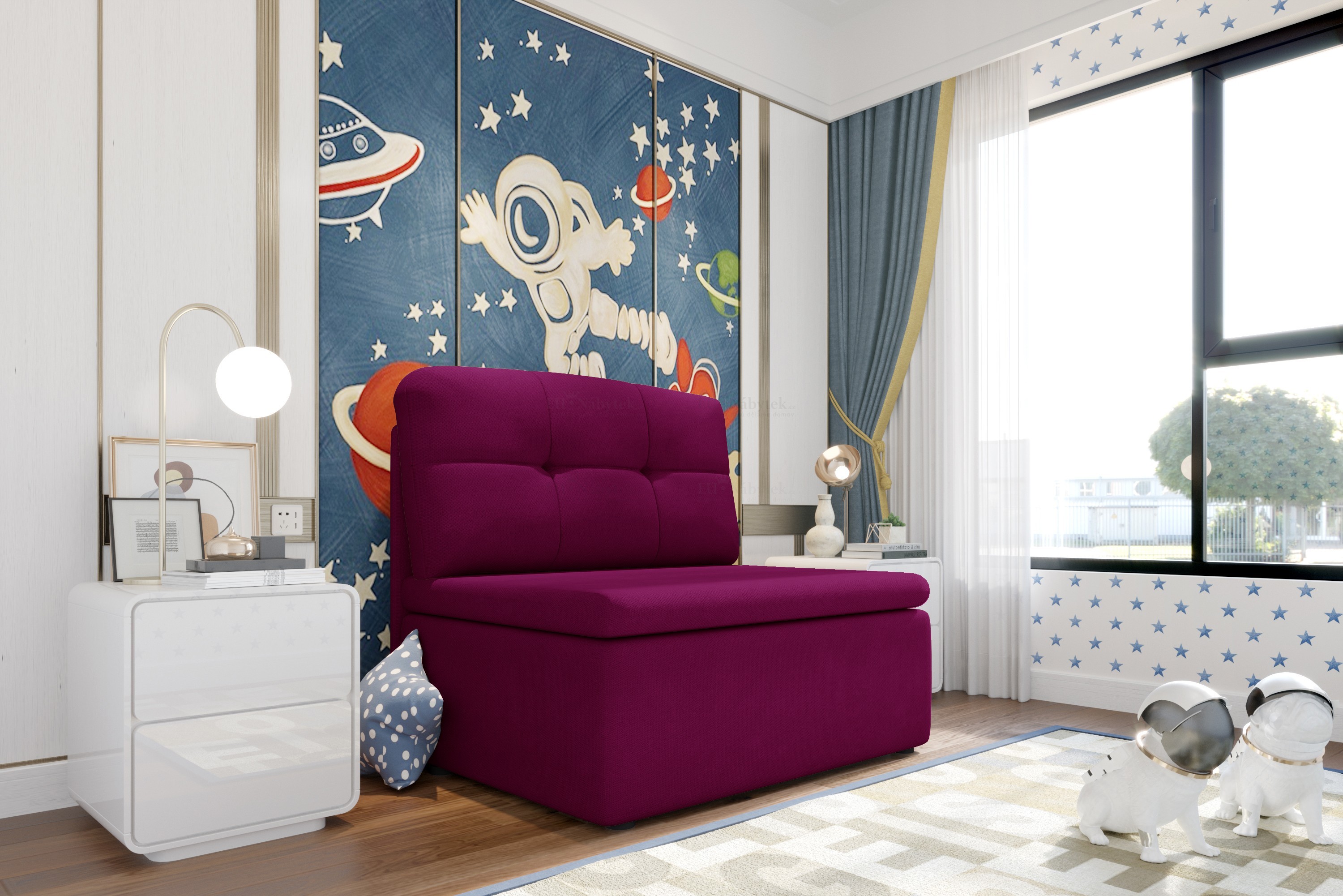 Rozkládací křeslo Hubert , které díky svému designu výborně zapadne do konceptu dětských pokojů, ale i například obývacího pokoje či menšího pokoje pro hosty. Díky praktickému rozkladu vám křeslo umožňuje pohodlné přespání jedné osoby. Plocha pro rozložení je 180x100cm. Celkové rozměry jsou 101x83x82cm. Čalouněné je látkou Sawana 05. V nabídce ve spoustě dalších barevných provedeních. Fota rozkladu jsou ilustrační.