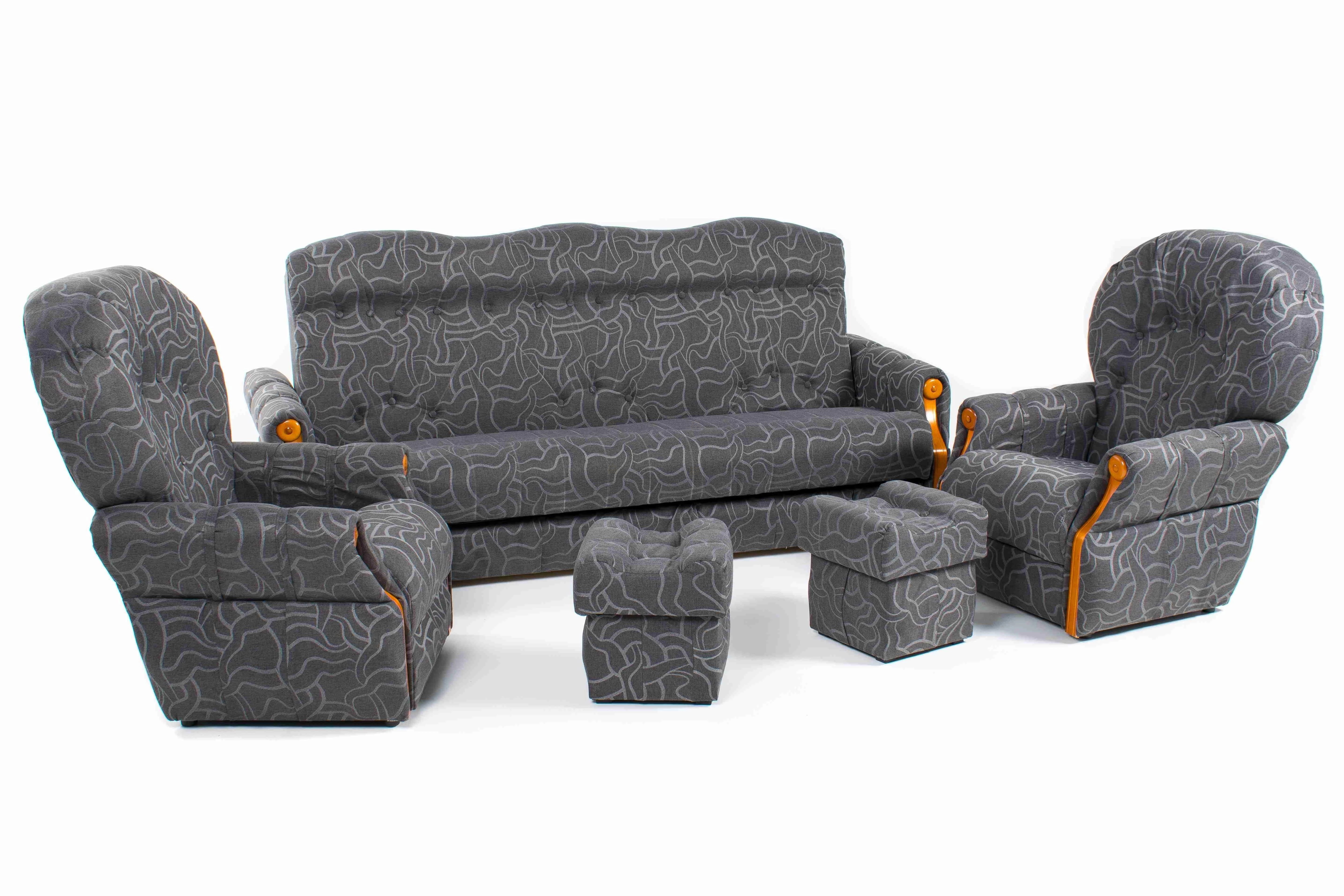 Pohodlná a prostorově nenáročná sedací souprava Palerma, která garantuje vysokou kvalitu provedení a dlouhou životnost. Sedací souprava má jednoduchý systém rozkládání včetně úložného prostoru. Souprava se skládá ze dvou křesel (75x70x100cm), dvou taburetů (36x36x36cm ) a pohovky (215x90x95cm), která po rozložení disponuje spací plochou 120x185cm. Taburety mají praktický úložný prostor. Čalounění tmavě šedá látka Bergamo. V nabídce i v jiném barevném provedení.