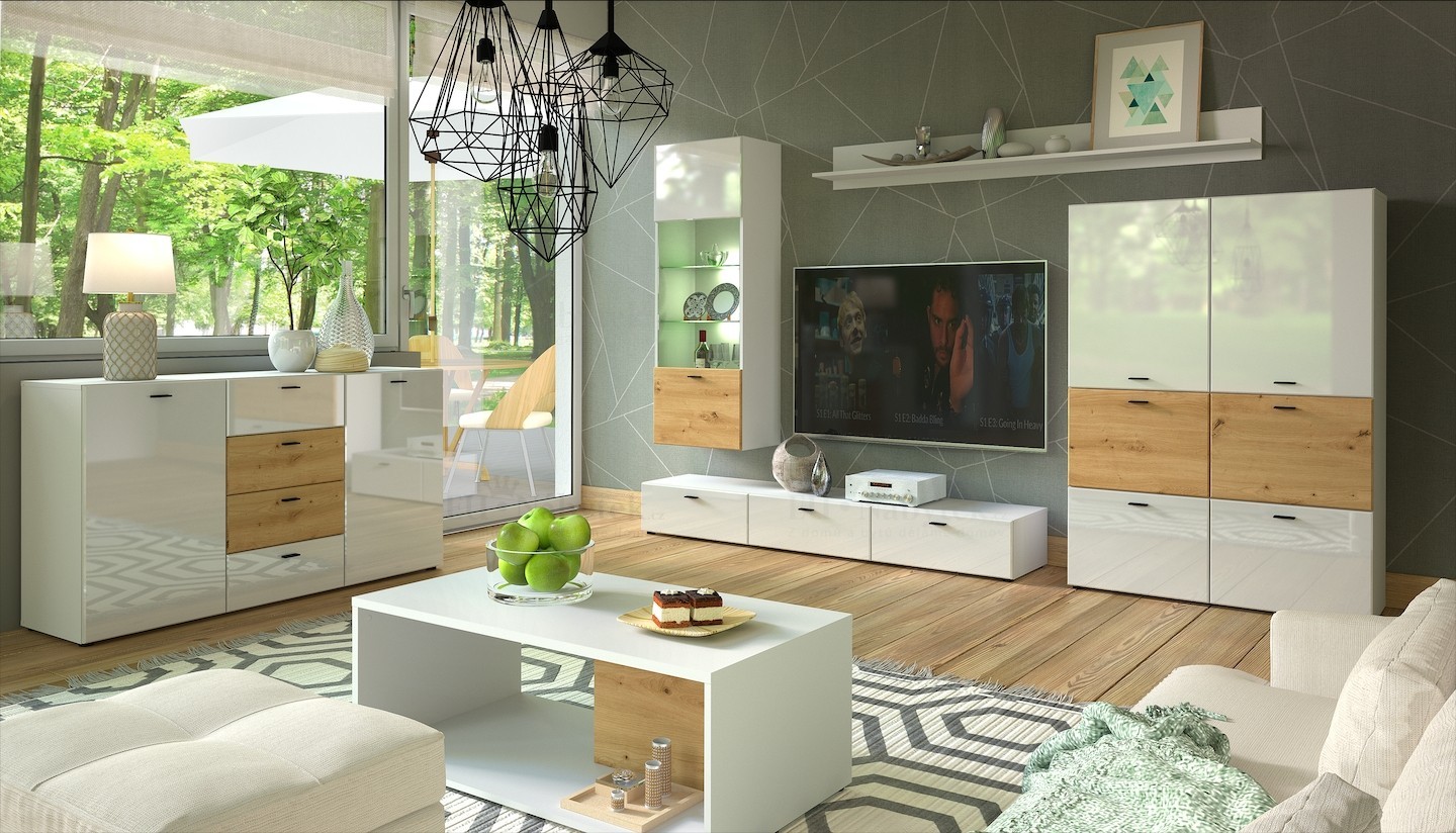 Kombinace bílý lesk a dub artisan opticky prosvětlí interiér a dodá mu nadčasový vzhled. Černé úchyty podtrhují moderní styl a perfektně ladí s dnešními trendy.