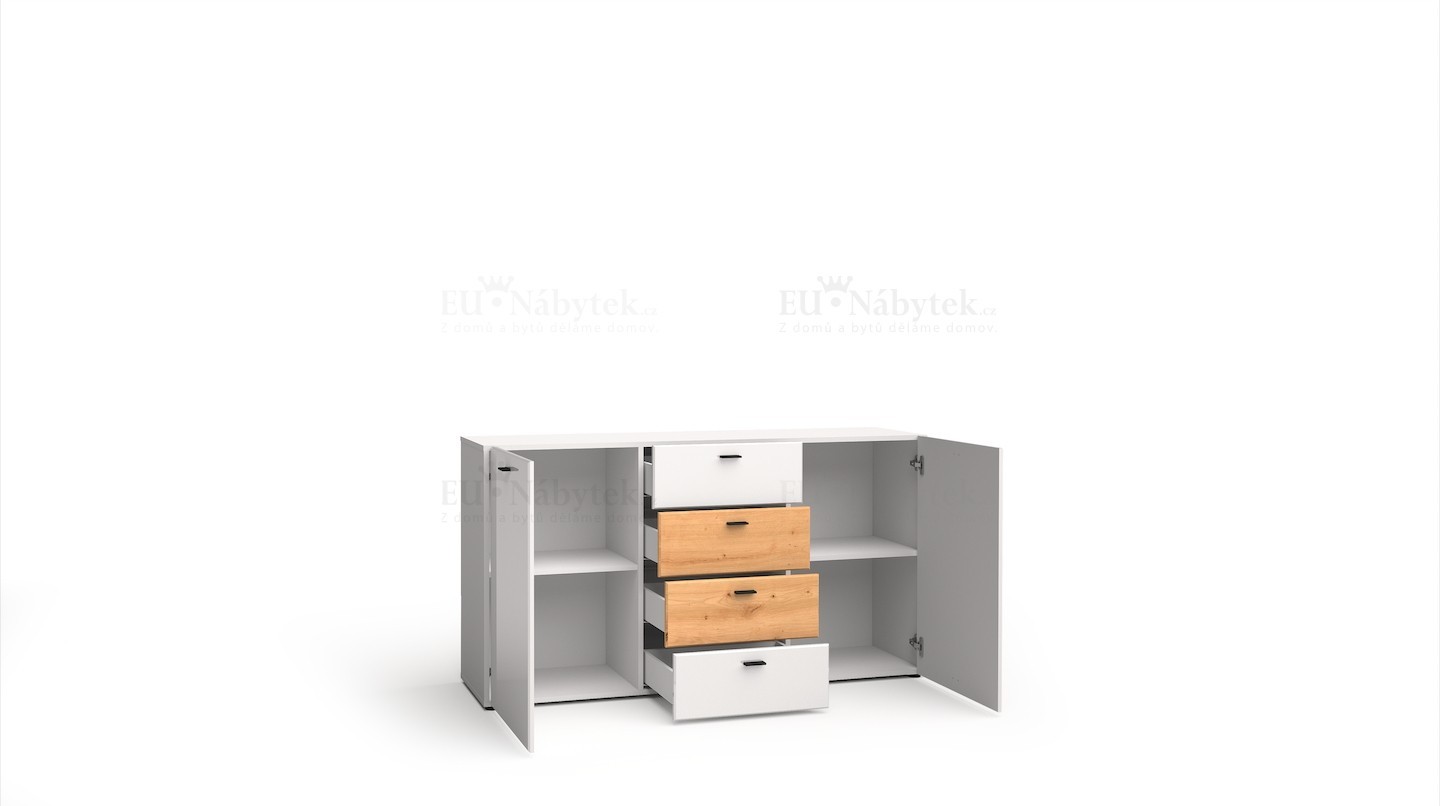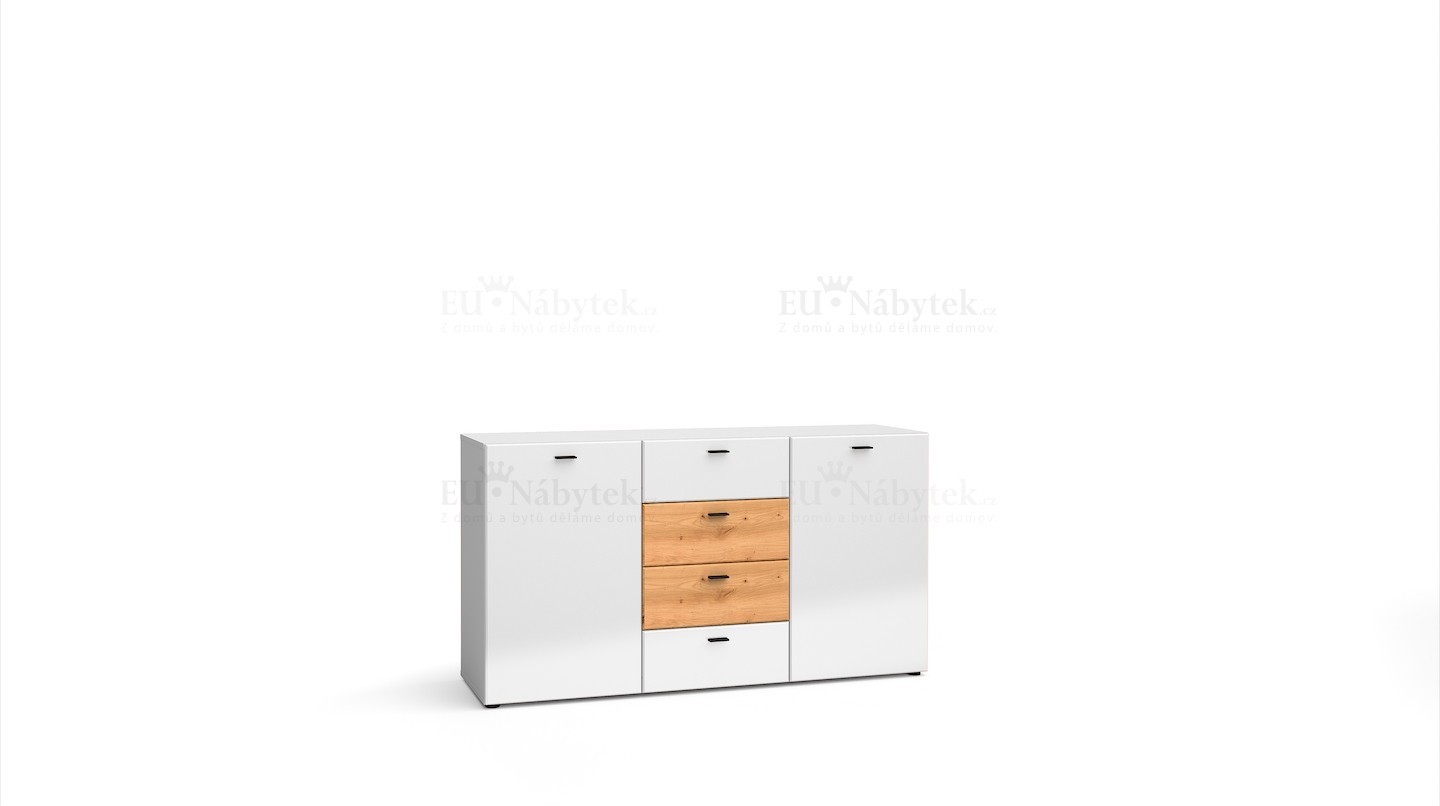 Komoda MILANES zdůrazňuje unikátní design nábytku. Stylová kompozice moderního nábytku zaručuje nejen reprezentativní zařízení daného interiéru, ale také i vysokou funkčnost, kterou ocení dokonce i nejnáročnější zákazníci. Spojení barev bílý lesk a dub artisan viditelné na dvířkách obohatí užitnou plochu a zároveň rozzáří její celý prostor. Doplněním celé kompozice jsou černé úchyty, které zdůrazňují moderní styl v interiérovém designu. Dodáváme v demontu. V nabídce i v jiném barevném provedení.Také možnost zakoupení konferenčního stolku a obývací stěny ze stejné kolekce.
